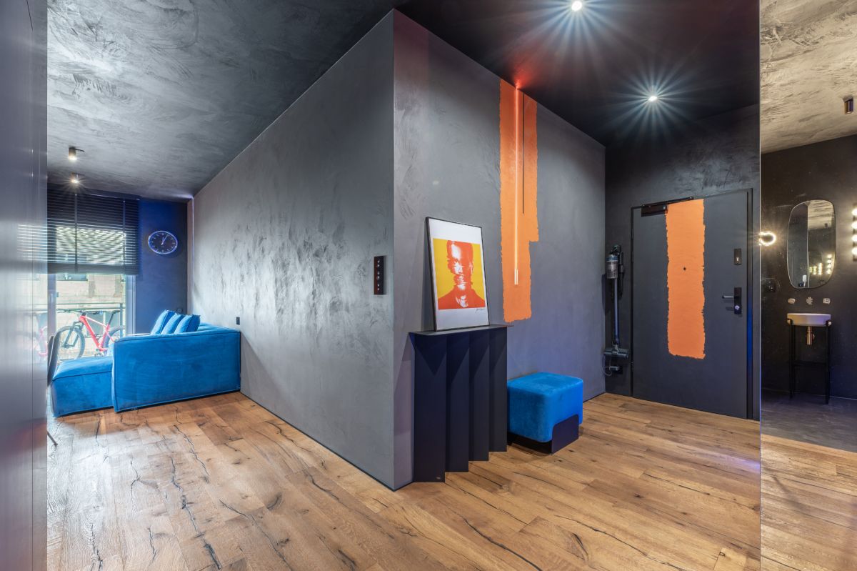 Wnętrza mieszkania zdominowane są przez surowe tekstury (ściany z nieszlifowanego mikrocementu) i głębokie, ciemne kolory (antracyt, matowa czerń), które stanowią idealne tło dla wyrazistych detali.