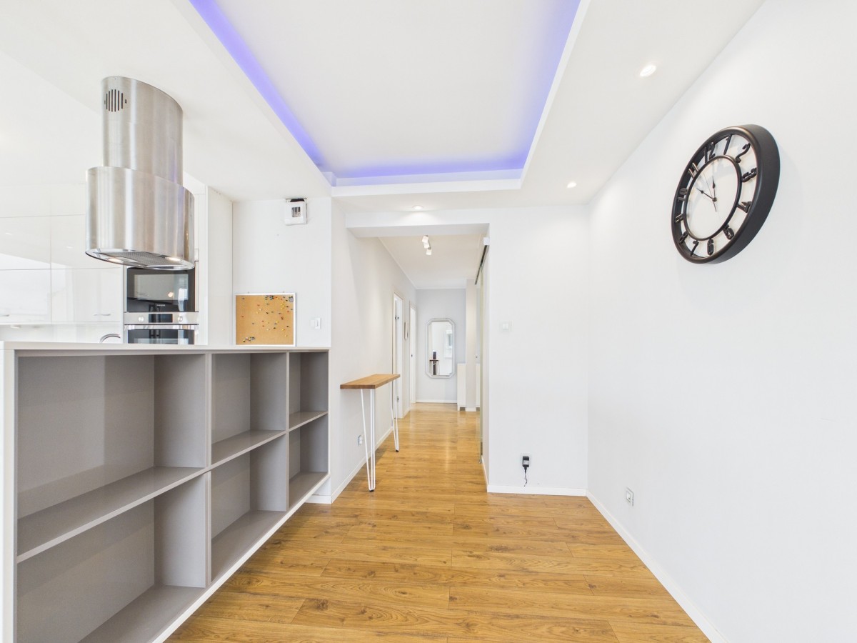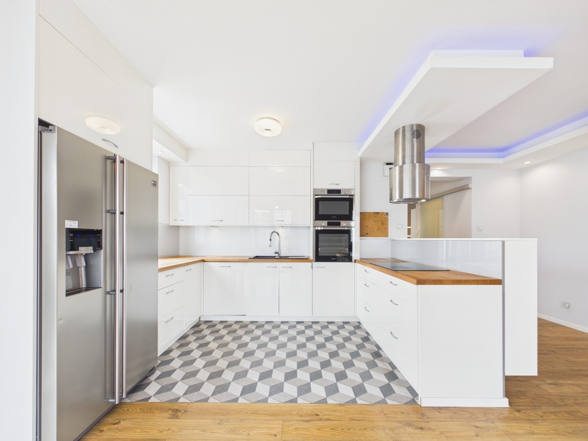 Mieszkanie zostało wykończone z materiałów wysokiej jakości, a w kuchni znajdują się funkcjonalne meble w zabudowie.