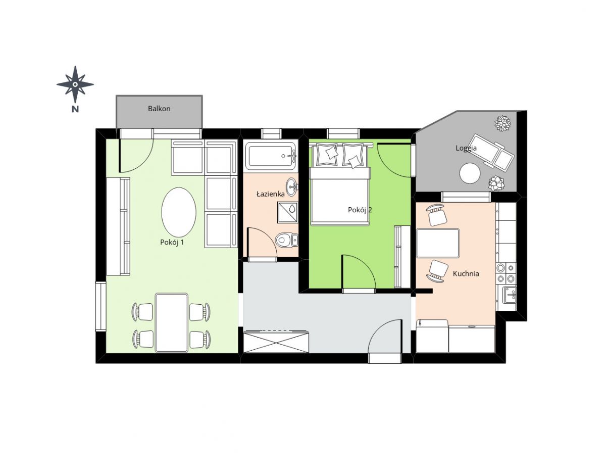 • Optymalna powierzchnia - na prawie 45 m.kw. znajdują się: okazały salon z balkonem, sypialnia z loggią, umeblowana, funkcjonalna kuchnia oraz wygodna łazienka.