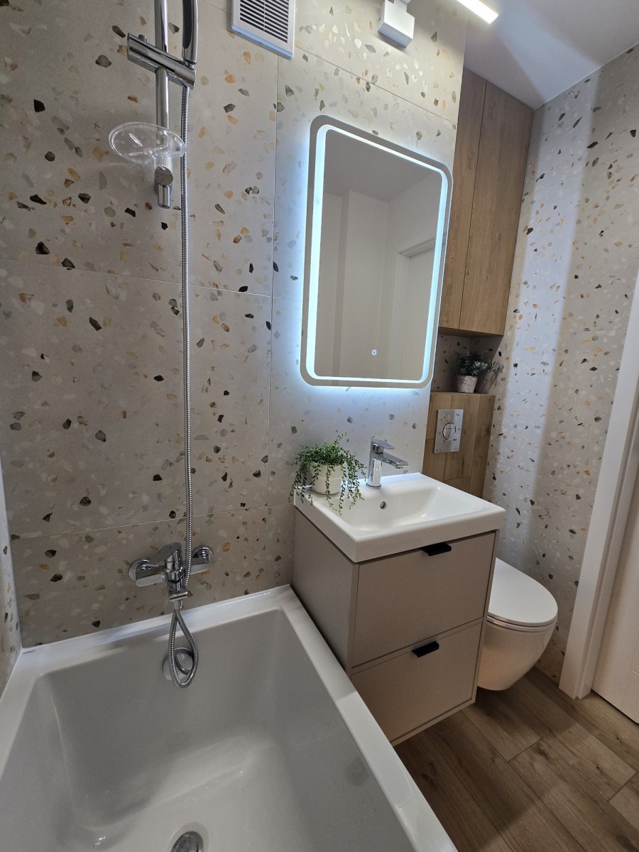 • łazienka z wanna i szafką nad geberitem wykonaną przez stolarza