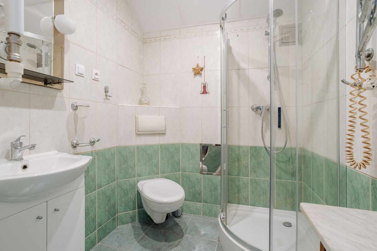 - Łazienka (3,03 m²) - wyposażona w prysznic, toaletę i umywalkę. Posiada miejsce do umieszczenia pralki - przenosząc umywalkę na ścianę od strony kuchni, a w miejsce umywalki umieszczając pralkę.
