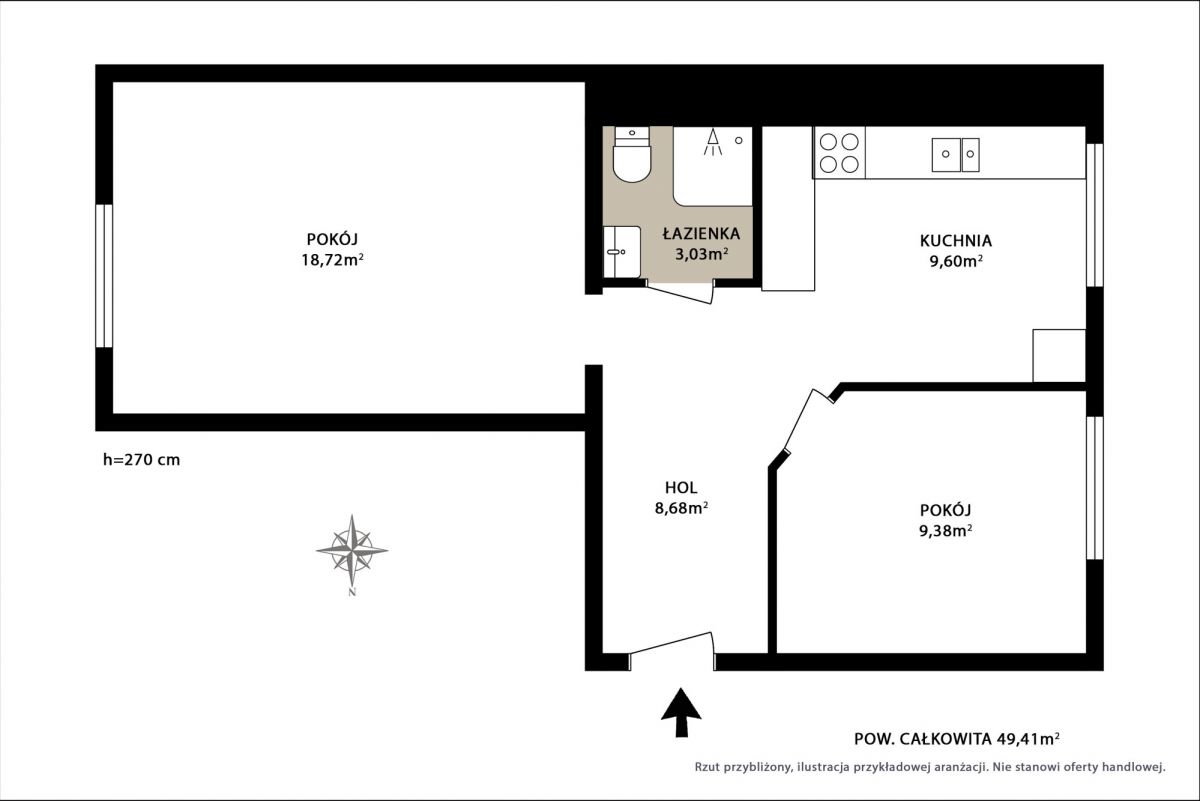 49,41 m² został zaprojektowany w sposób przemyślany i praktyczny, z wyraźnym podziałem na strefę dzienną i prywatną. Układ mieszkania maksymalnie wykorzystuje dostępną przestrzeń, oferując funkcjonalność, wygodę i możliwość komfortowego życia na co dzień. Dwustronna ekspozycja zapewnia dostęp do naturalnego światła przez cały dzień.