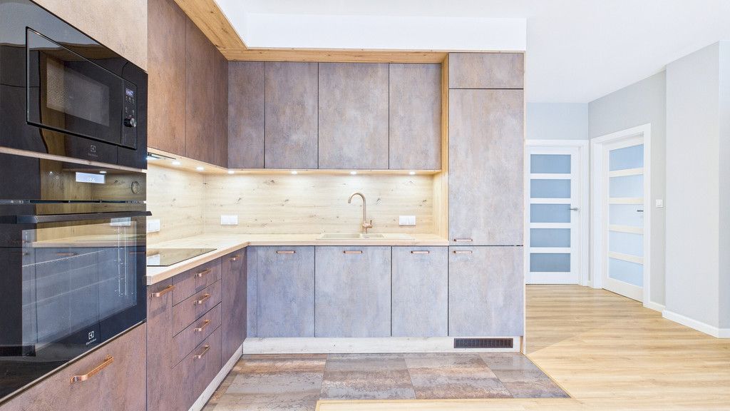 - spójne wykończenie: deska podłogowa w pokojach, gres w części kuchennej i łazience