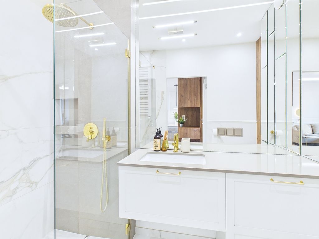 Łazienka: Wykończona w nowoczesnym stylu.