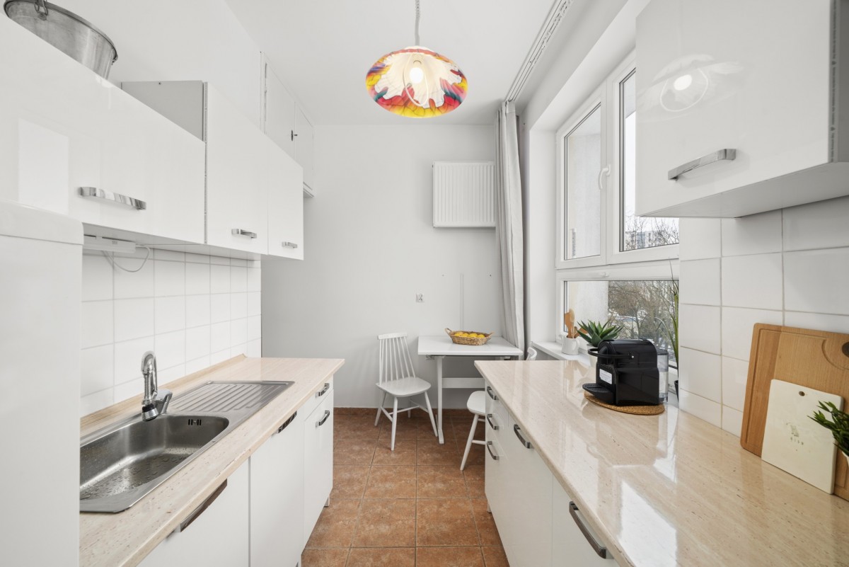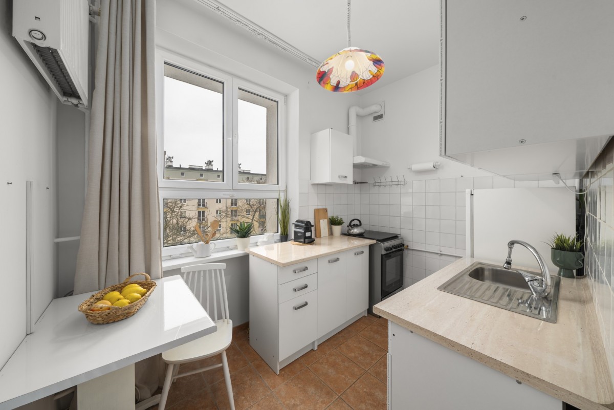 Przez to, że okna wychodzą na zachód, to mieszkanie jest bardzo jasne. Od następnych bloków oddziela nas podwórko z drzewami, których korony są równe z oknami.