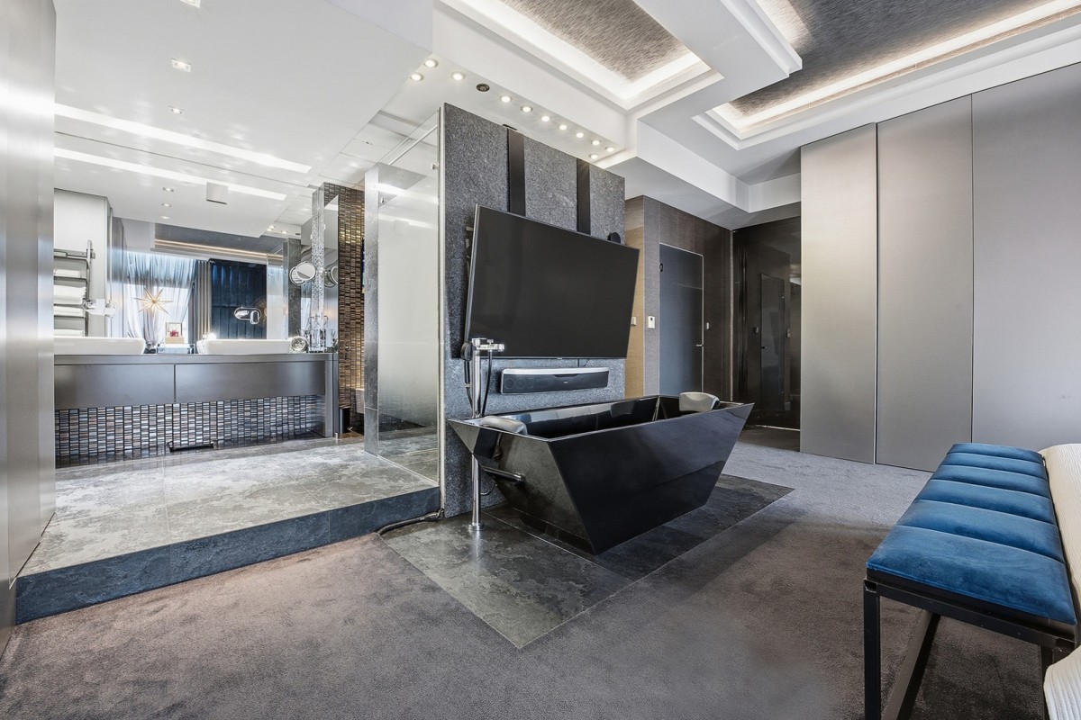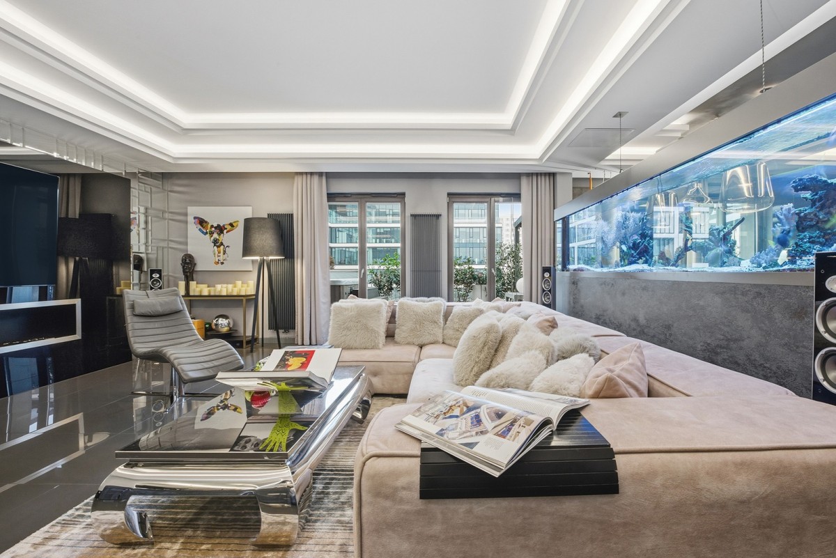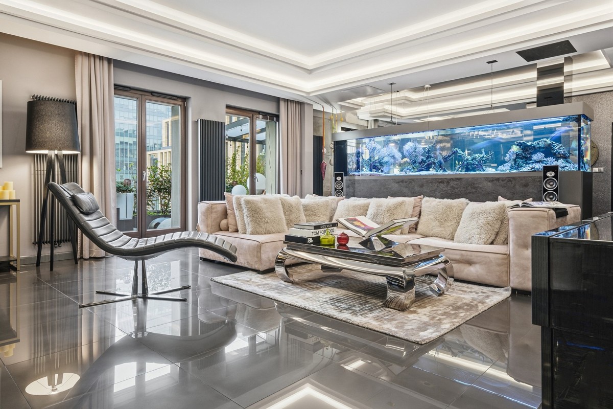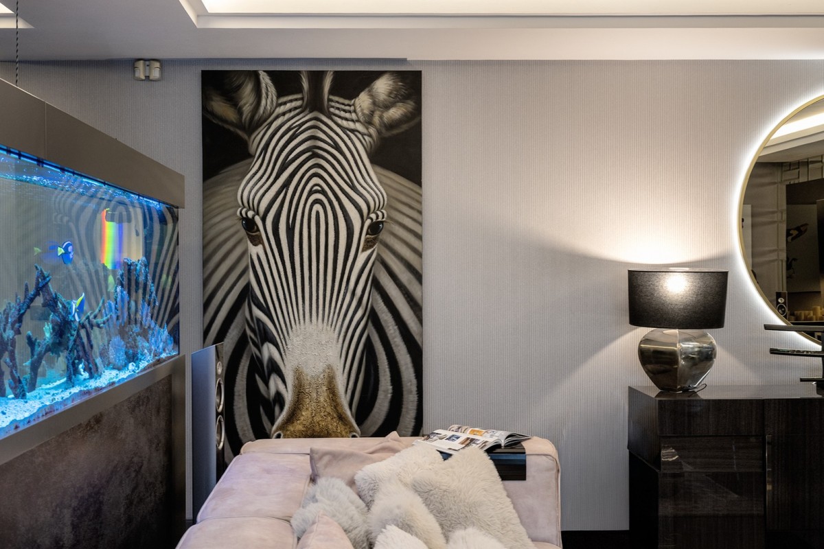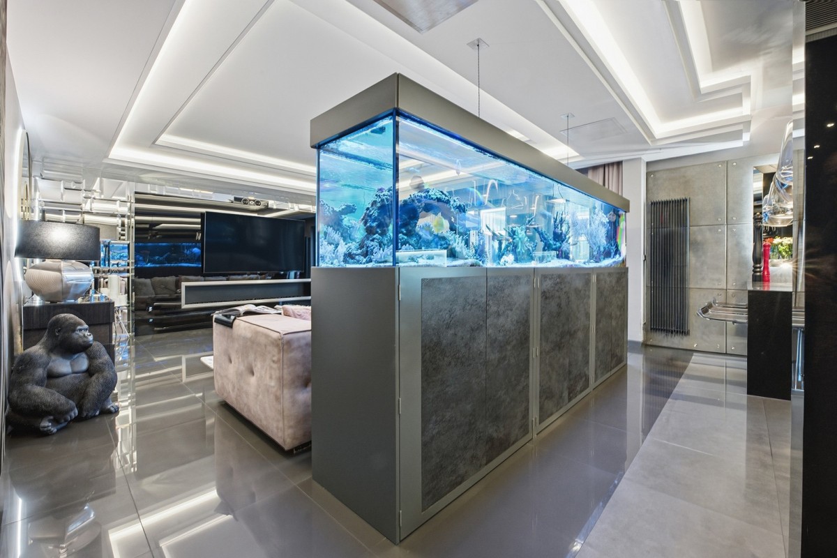 Centralnym punktem apartamentu jest niespotykanej wielkości akwarium oceaniczne. To miejsce, nie tylko stanowi element wystroju. Ono wyznacza własny rytm, w którym woda i refleksy światła koją zmysły.