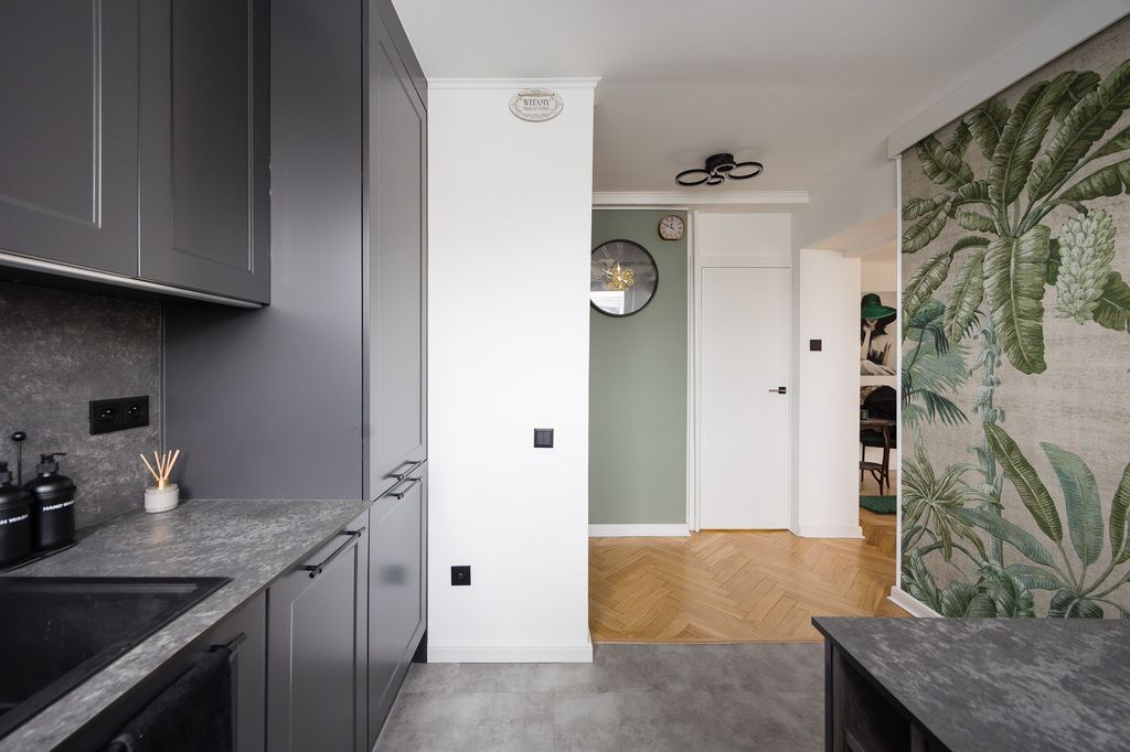 Na podłogach położono parkiet dębowy oraz gres. Kuchnia jest oddzielna, dobrze doświetlona i wyposażona w pełną zabudowę meblową oraz sprzęt AGD w zabudowie.