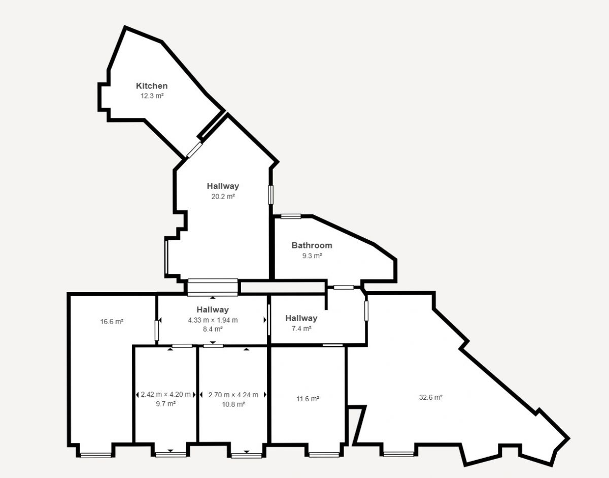 - Obecnie mieszkanie podzielone jest na 5 pokoi o różnej wielkości, z których największy ma 3 okna i wyjście na balkon.