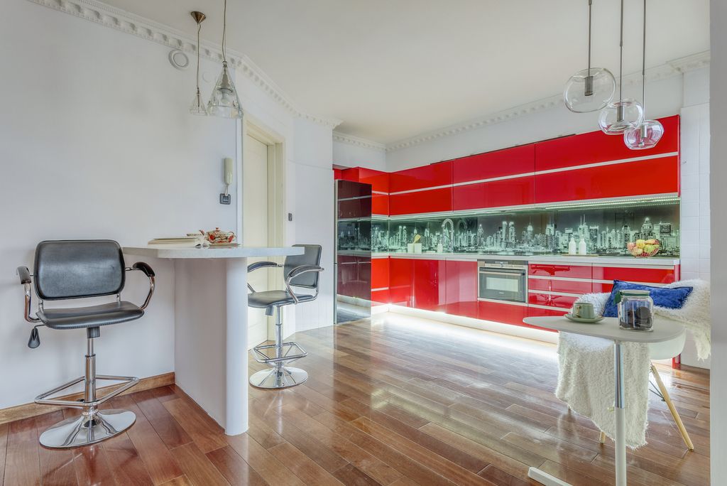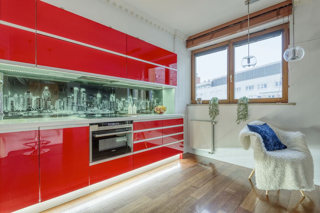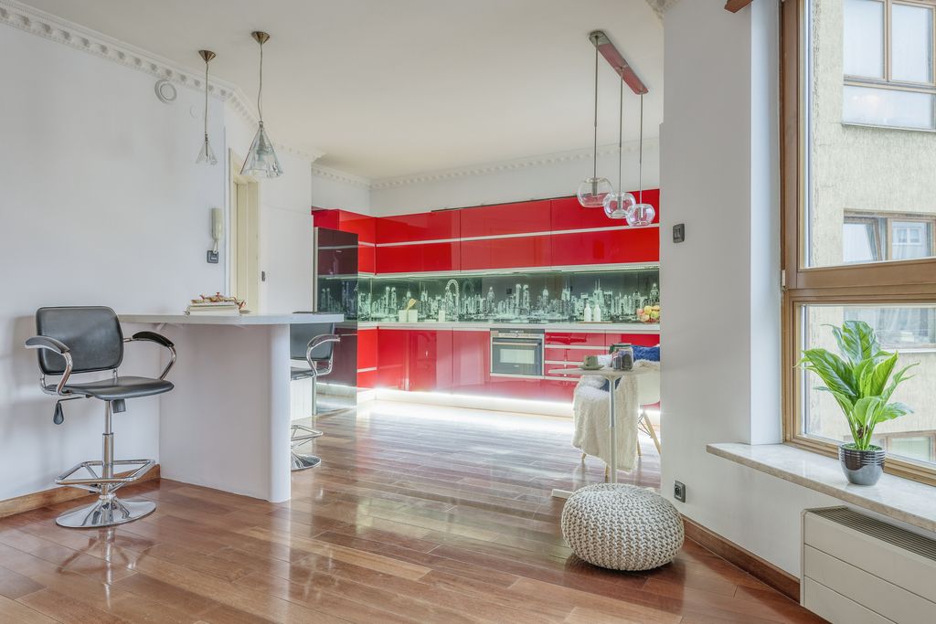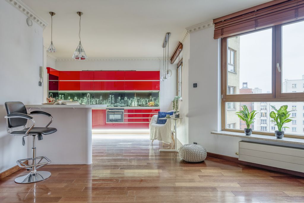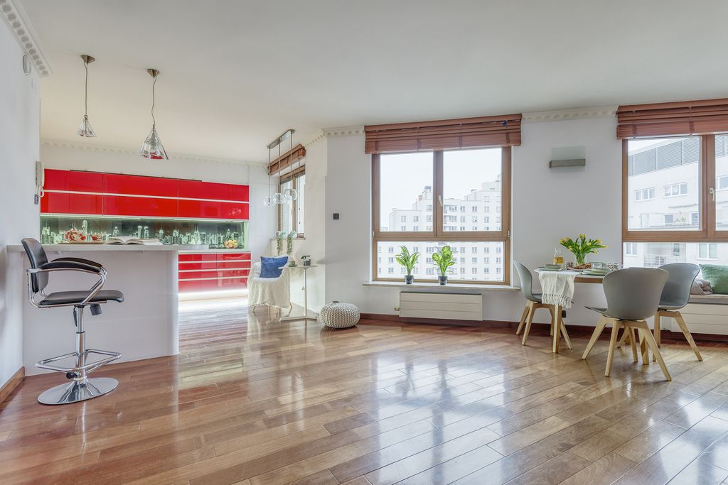 - salon – ok. 33 m² z dużymi oknami i widokiem na panoramę miasta