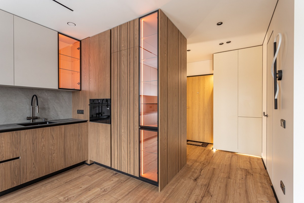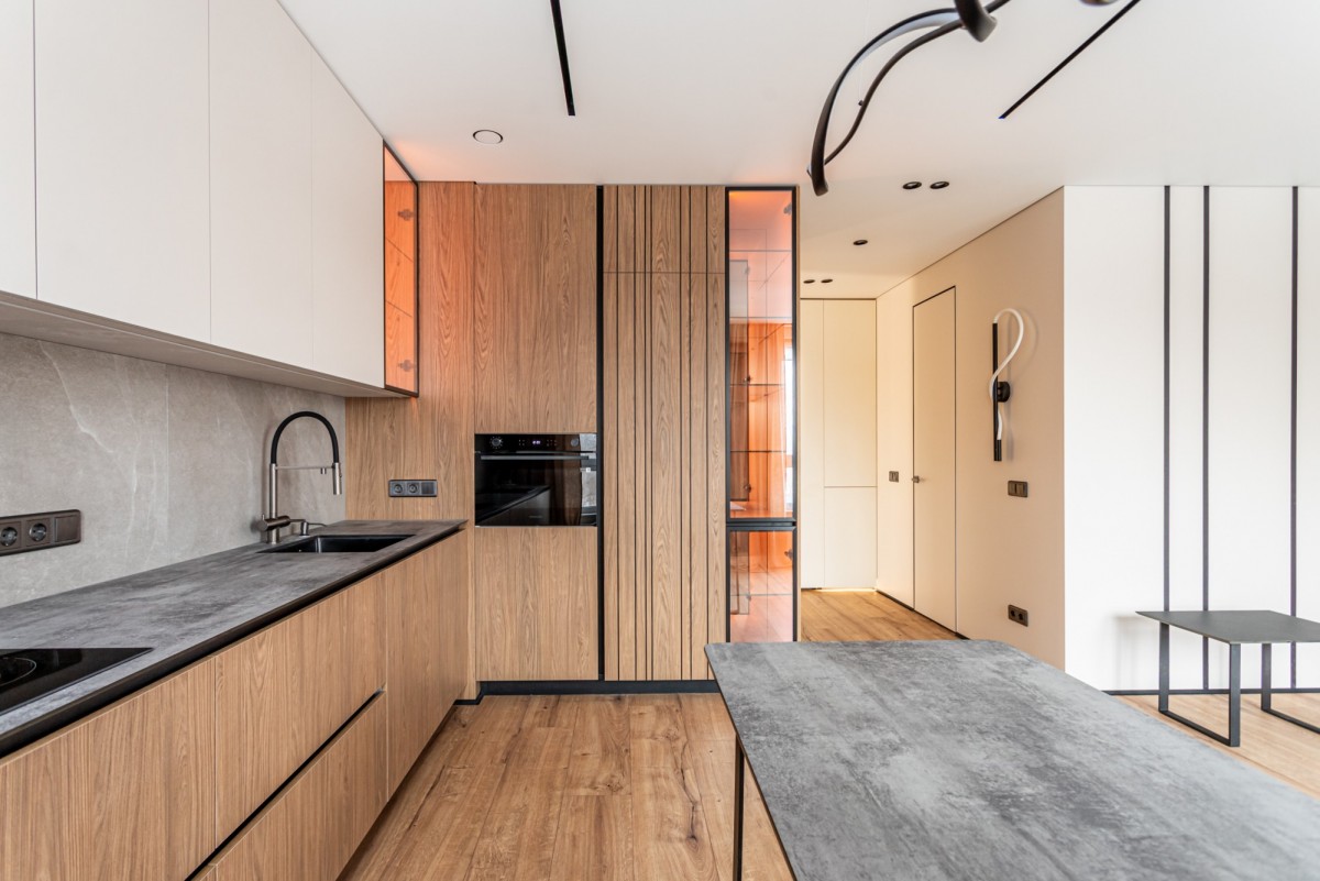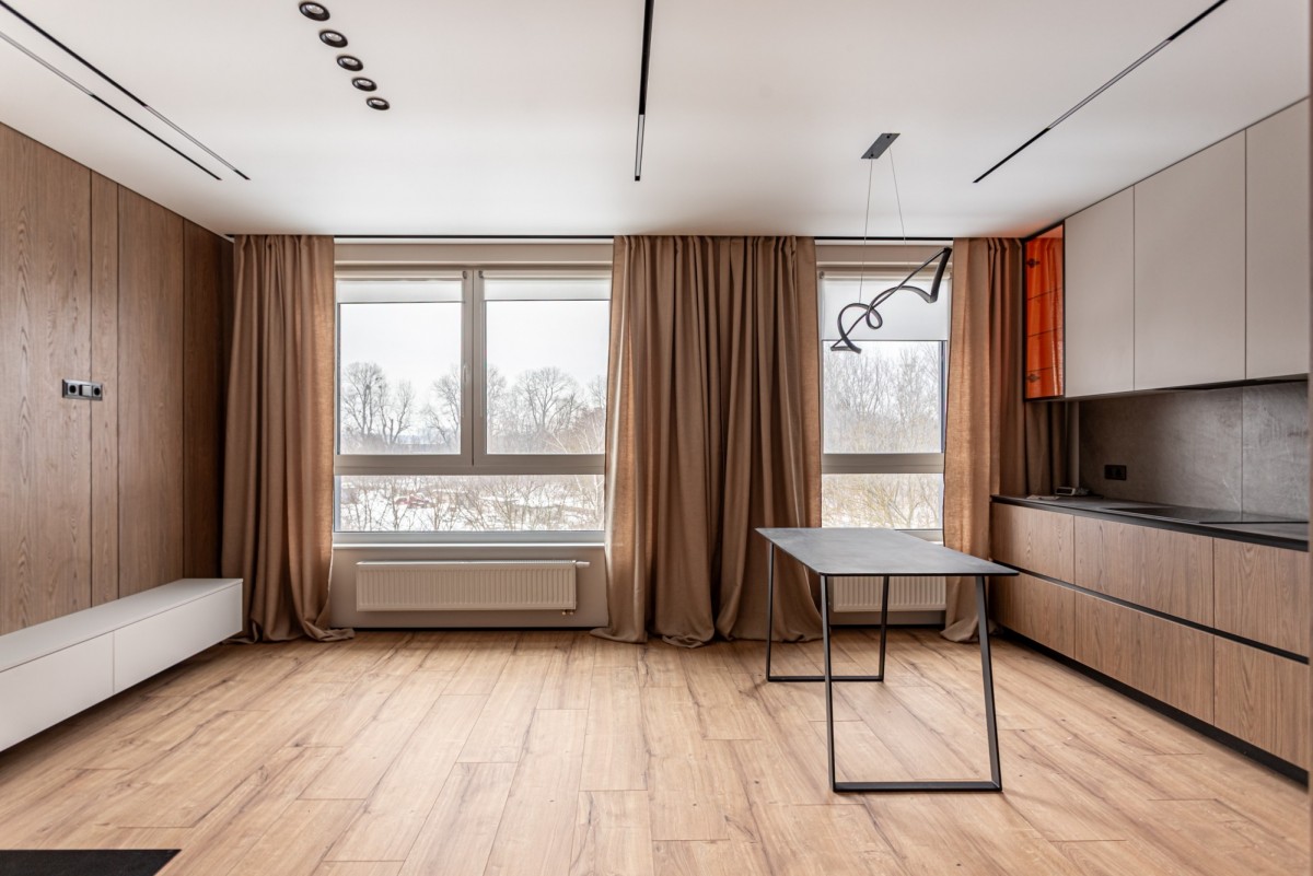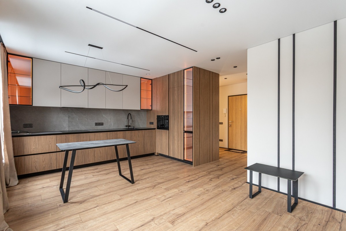Wnętrze zostało wykończone w eleganckim, spójnym stylu, z dużą dbałością o detale i jakość materiałów: sufit napinany z systemem oświetlenia szynowego oraz designerskie karnisze marki Maytoni nadają przestrzeni nowoczesny, minimalistyczny charakter, zabudowa meblowa wykonana z płyt Egger z frontami MDF oraz wysokiej klasy okuciami Blum, blat kuchenny oraz stół z wytrzymałej płyty kompaktowej HPL - odpornej na wilgoć i uszkodzenia mechaniczne, drzwi wewnętrzne w systemie ukrytym, w aluminiowych ościeżnicach z włoskimi zawiasami, podkreślające nowoczesną estetykę,podłogi wykończone panelami Swiss Krono z designerską listwą sprowadzaną z Belgii. Mieszkanie jest