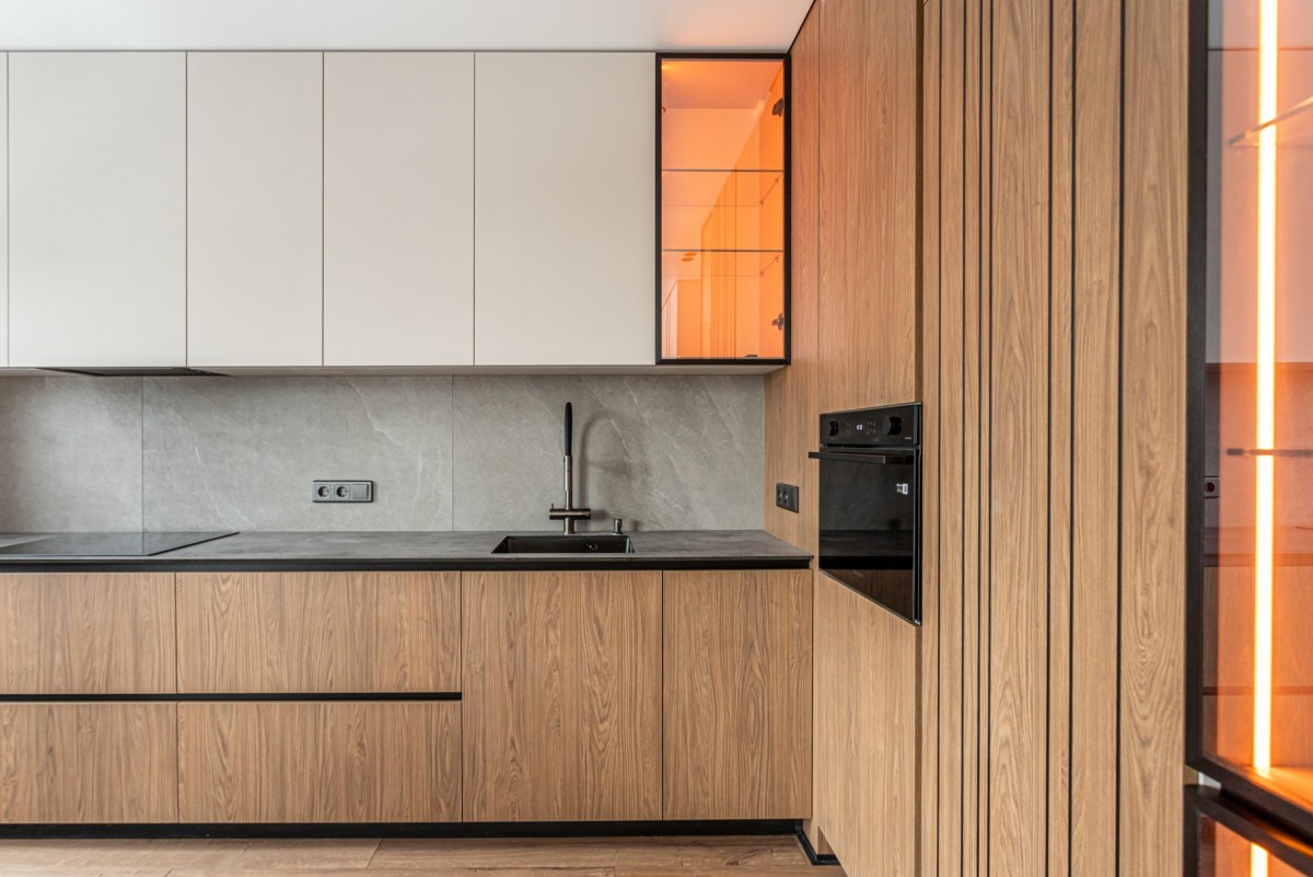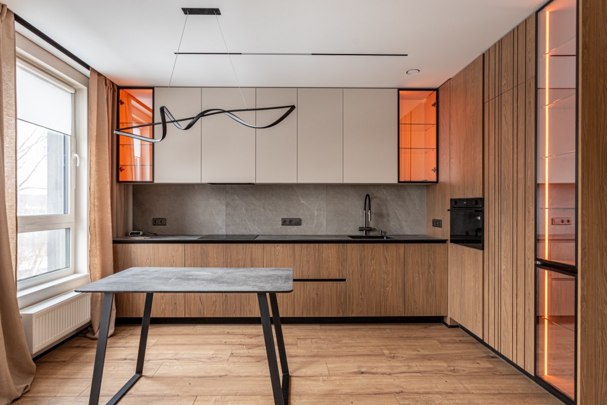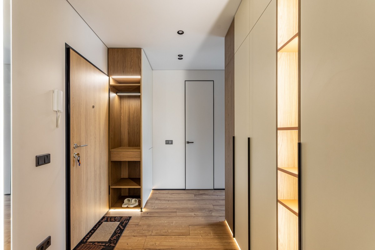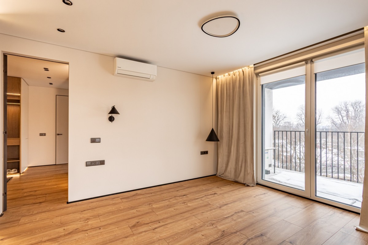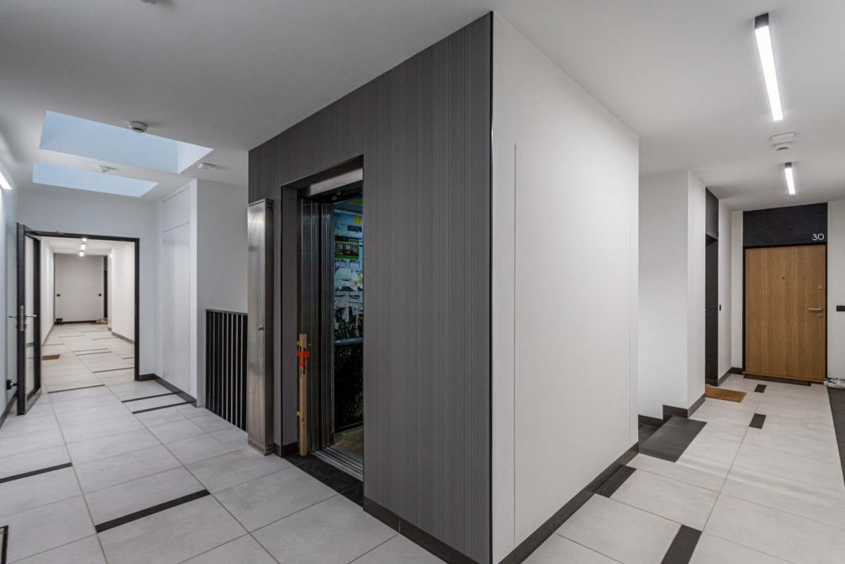 Wnętrze zostało wykończone w eleganckim, spójnym stylu, z dużą dbałością o detale i jakość materiałów: sufit napinany z systemem oświetlenia szynowego oraz designerskie karnisze marki Maytoni nadają przestrzeni nowoczesny, minimalistyczny charakter, zabudowa meblowa wykonana z płyt Egger z frontami MDF oraz wysokiej klasy okuciami Blum, blat kuchenny oraz stół z wytrzymałej płyty kompaktowej HPL - odpornej na wilgoć i uszkodzenia mechaniczne, drzwi wewnętrzne w systemie ukrytym, w aluminiowych ościeżnicach z włoskimi zawiasami, podkreślające nowoczesną estetykę,podłogi wykończone panelami Swiss Krono z designerską listwą sprowadzaną z Belgii. Mieszkanie jest