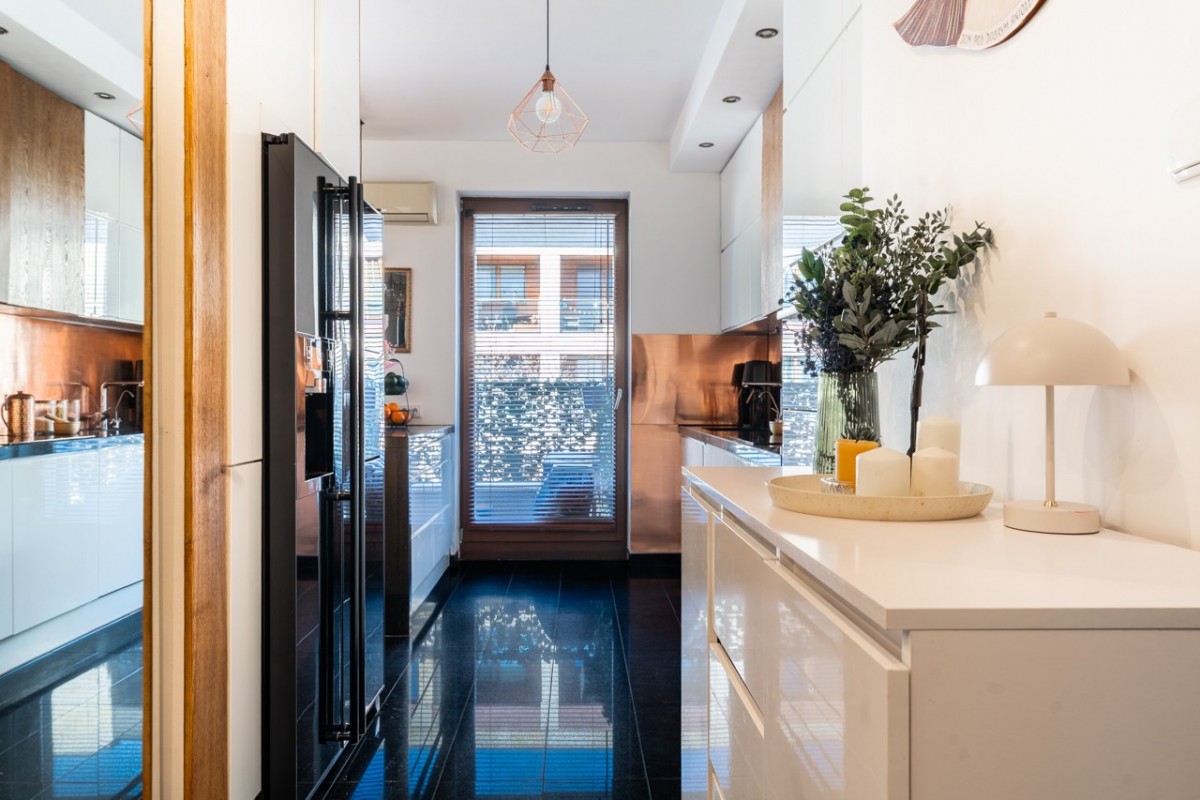 - blaty kuchenne wykonane z granitu, a na ścianie naturalna miedź