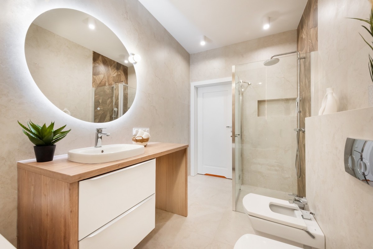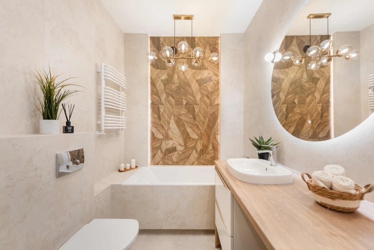 W salonie znajduje się biokominek nadający klimat apartamentu. Łazienka wyposażona jest w wannę oraz kabiną prysznicową typu walk-in.