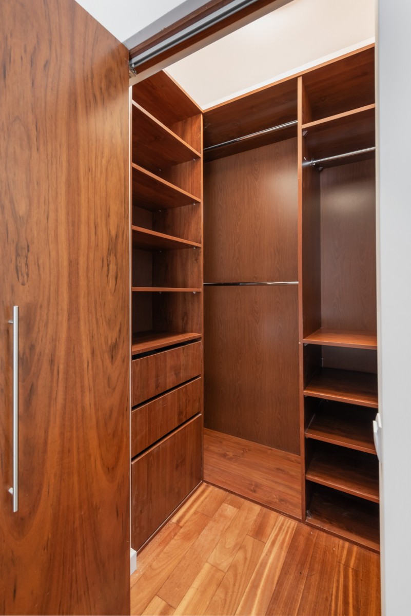 Dodatkowe wyposażenie mieszkania obejmuje system sterowania elektrycznymi żaluzjami. Przestrzenie do przechowywania zostały zaplanowane z uwzględnieniem licznych wnęk i szaf.