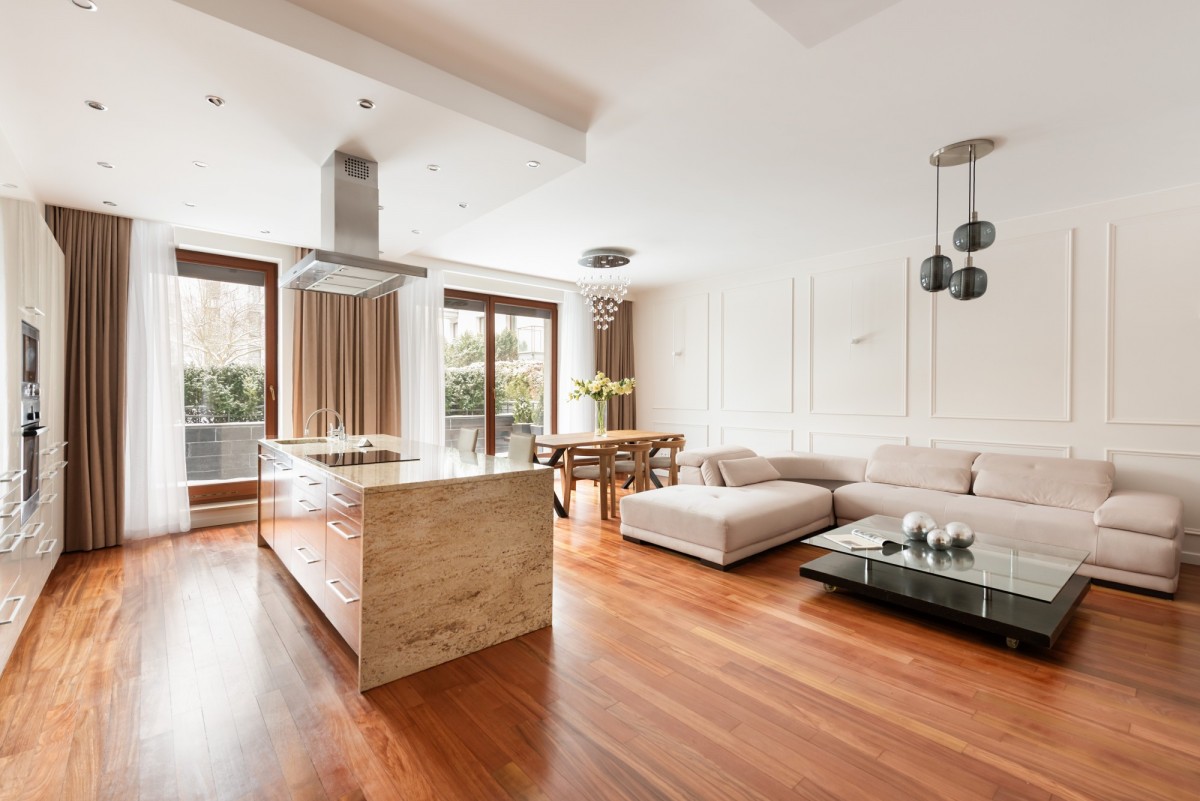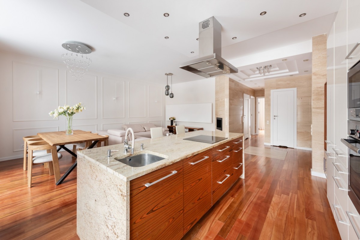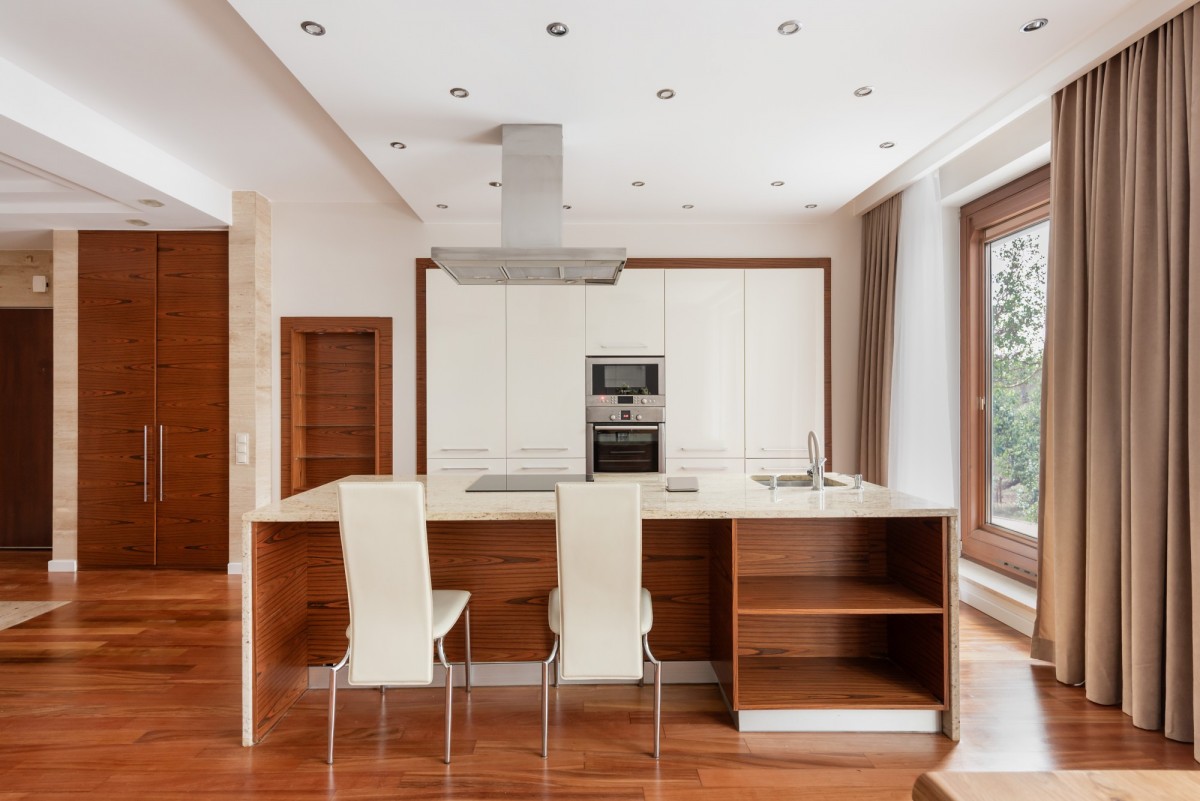 Wysoki standard wykończenia - zabudowy na wymiar, wyspa kuchenna, egzotyczne drewno
