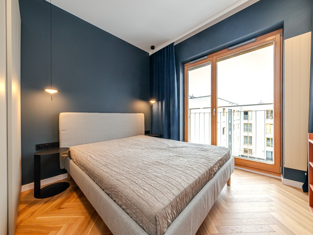 The flat is located in Błonia Wilanowskie, an attractive and developed part of Wilanów. There are shops, restaurants, service outlets and public transport stops in the immediate vicinity. Nearby, there is a so-called town square and extensive green areas, which is an additional advantage, especially for dog owners and active people.