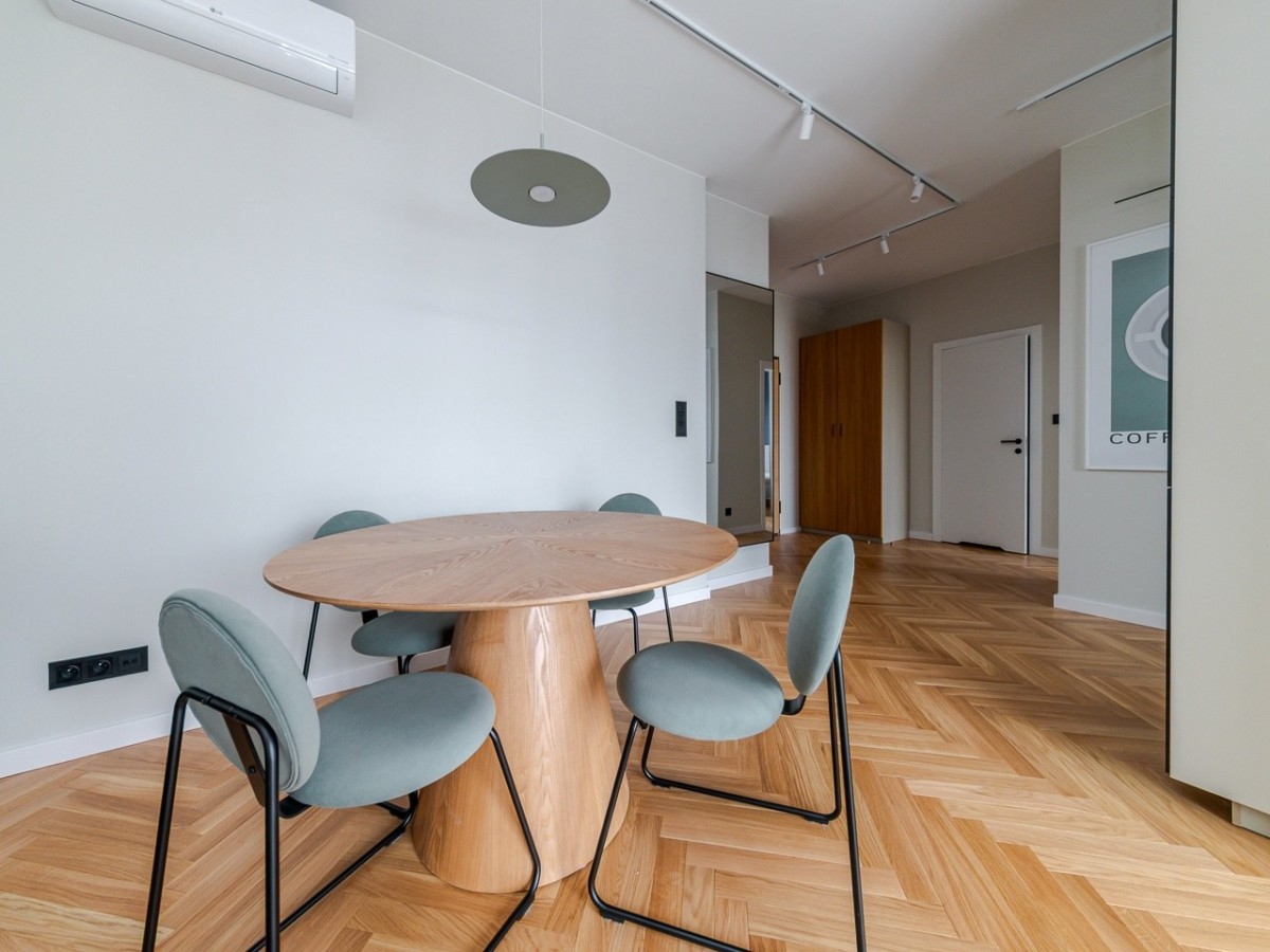 The flat has been redesigned and completely renovated. All installations have been replaced, the number of light points and electrical sockets has been increased, fibre optic cable, air conditioning and a new video intercom have been installed. The wooden window frames have been renovated and new oak parquet flooring in a classic herringbone pattern has been laid. The ceiling height is 2.85 m.