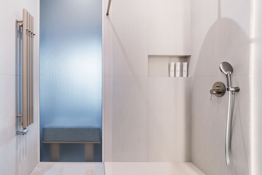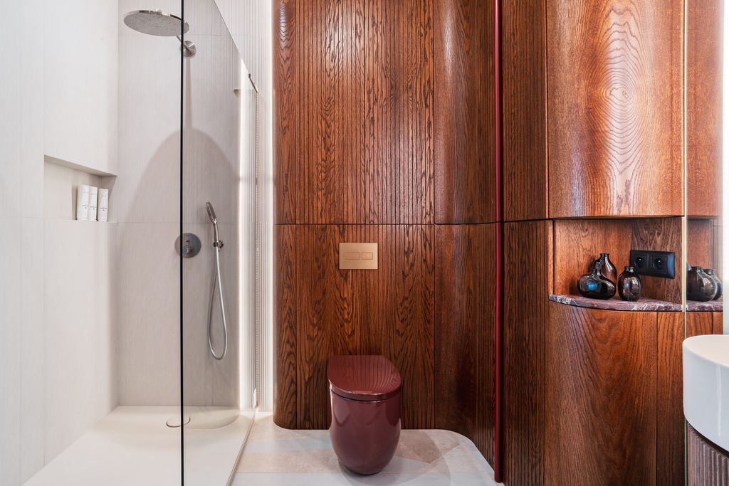 - Łazienka (ok. 4,5 m²): eleganckie płytki, prysznic walk-in, wysokiej jakości armatura.