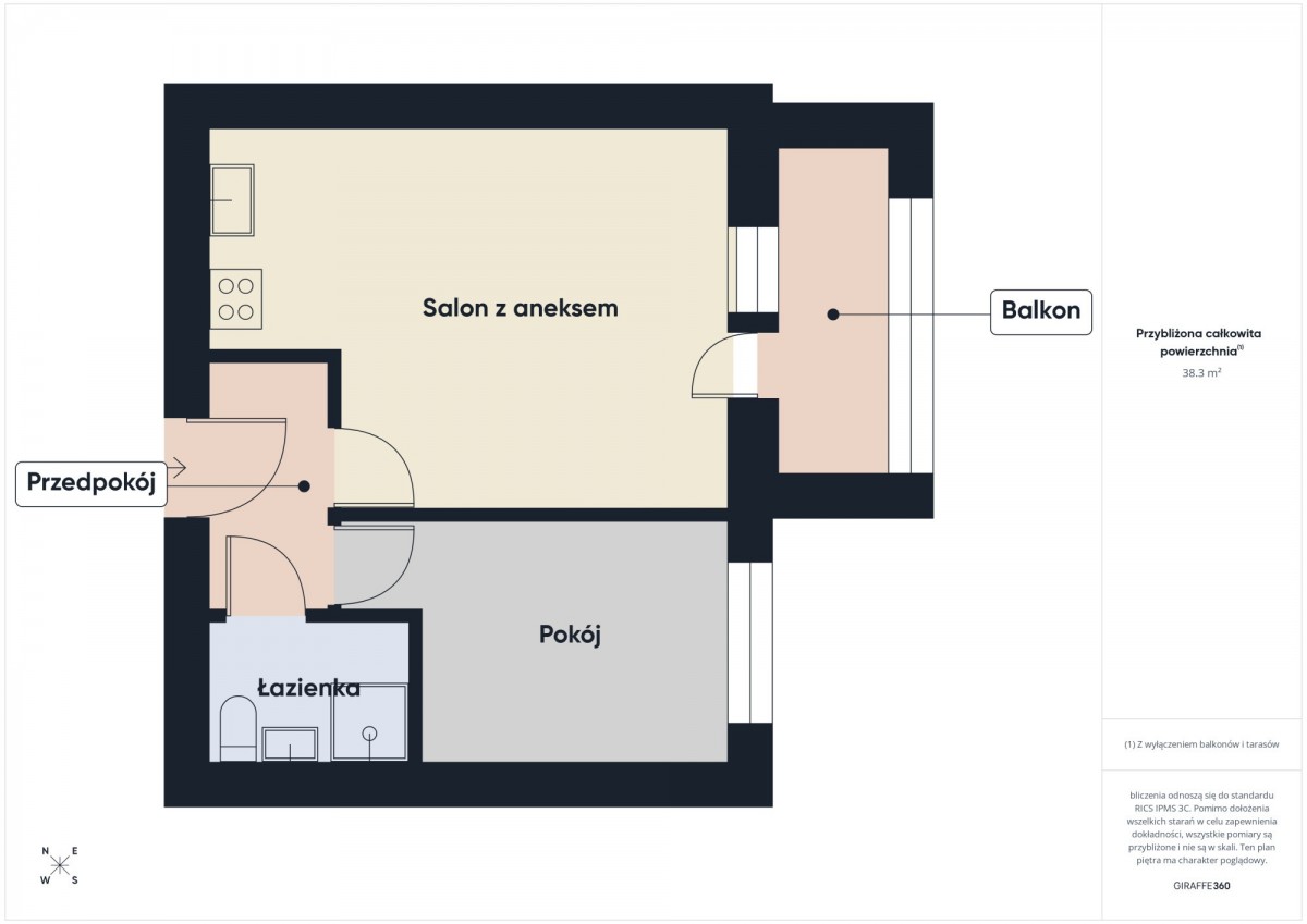 - 2 pokoje, w tym salon z aneksem kuchennym