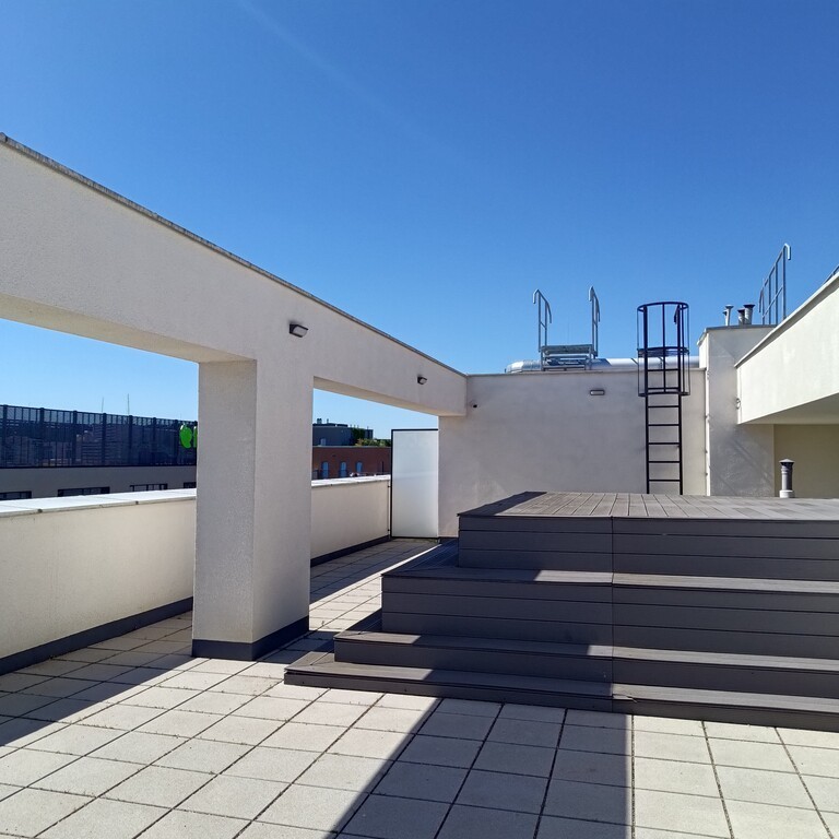 - Strefa relaksu na dachu budynku z miejscem do wypoczynku i widokiem na miasto