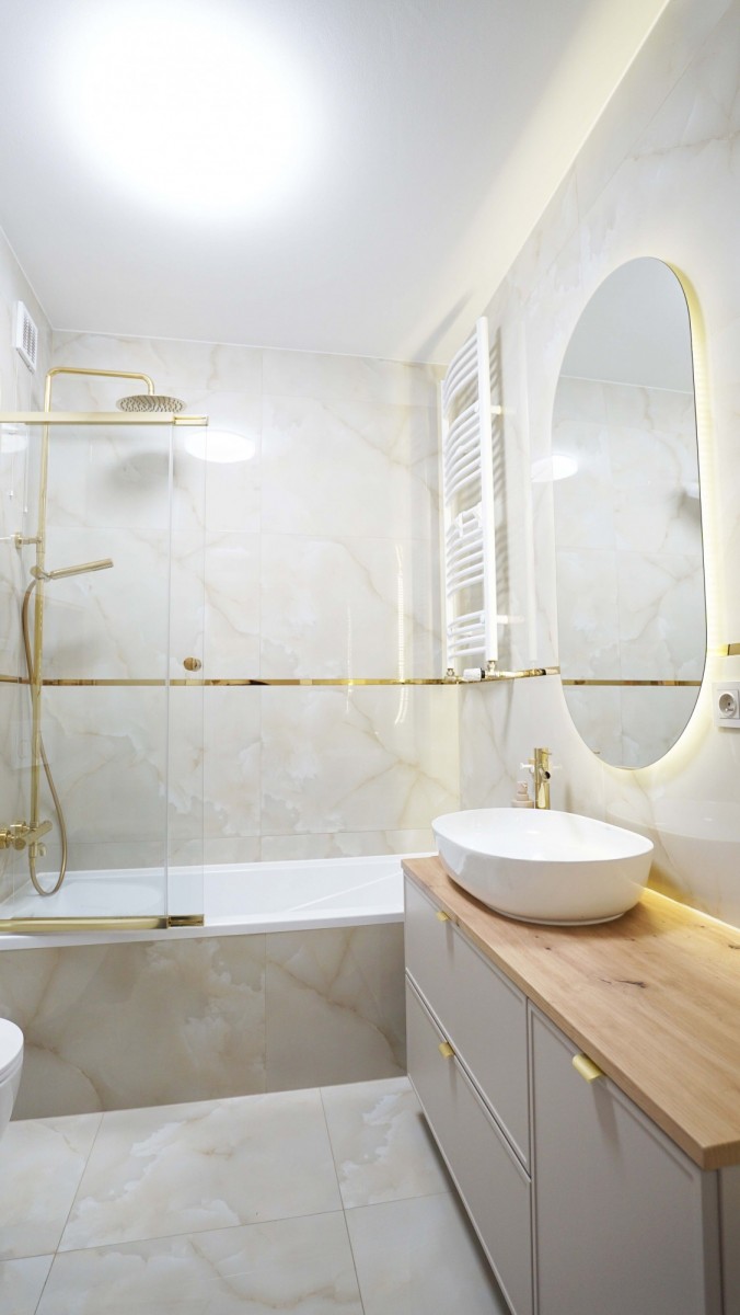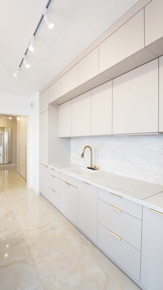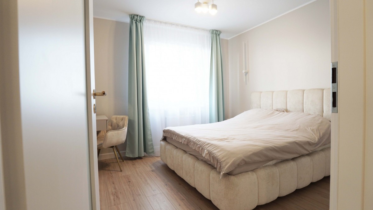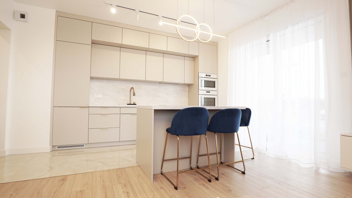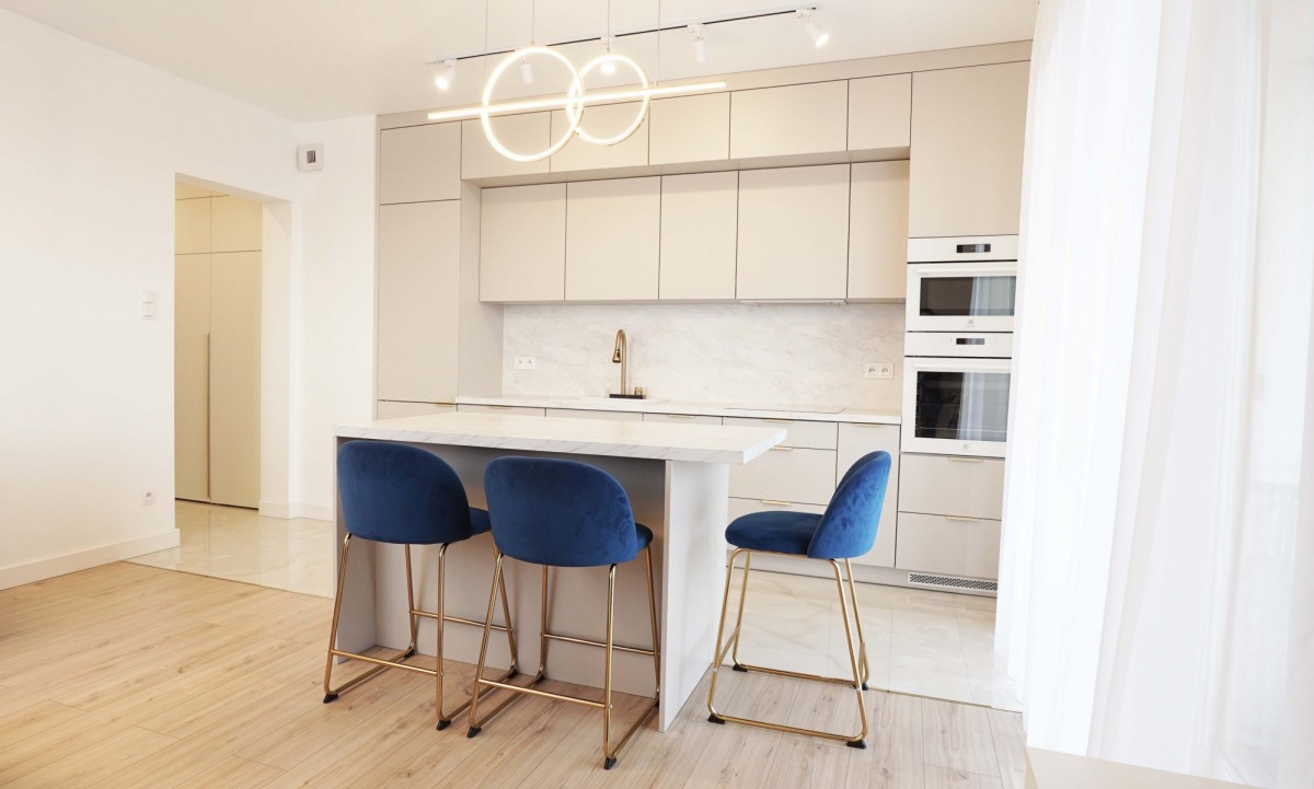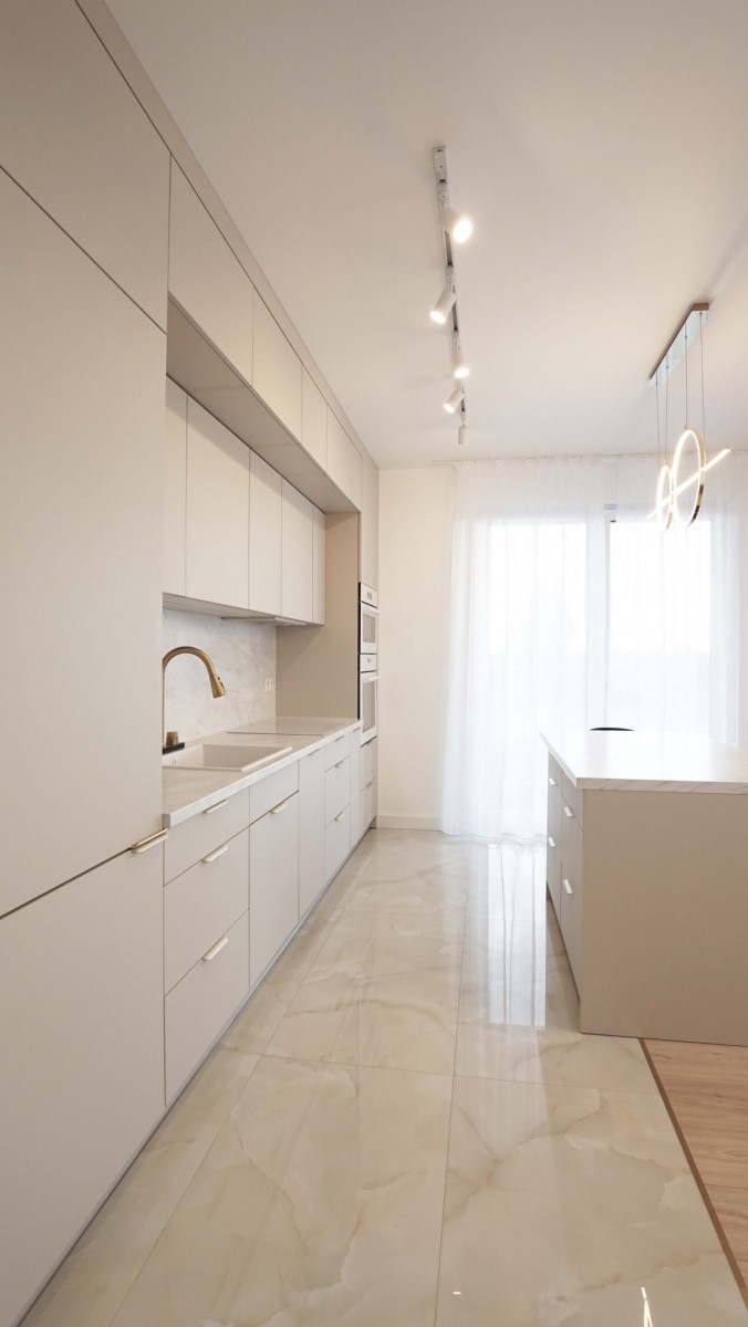 Wnętrze zostało zaprojektowane w nowoczesnym stylu, z dużą dbałością o funkcjonalność i estetykę. Mieszkanie jest bardzo jasne, dzięki dużym przeszkleniom i korzystnej ekspozycji, co sprawia, że wnętrza są naturalnie doświetlone przez większą część dnia. Jasne pomieszczenia, przemyślany układ oraz wysokiej jakości materiały wykończeniowe zapewniają komfort codziennego życia.