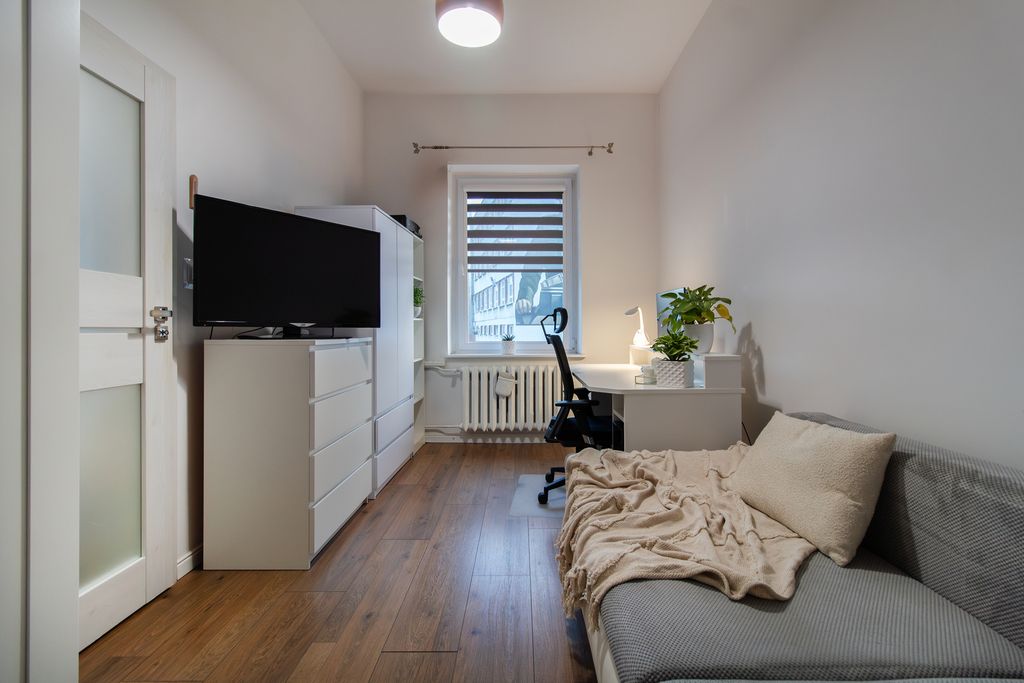 - Funkcjonalny układ – 2 pokoje, oddzielna kuchnia, łazienka, osobne WC i przestronny przedpokój.