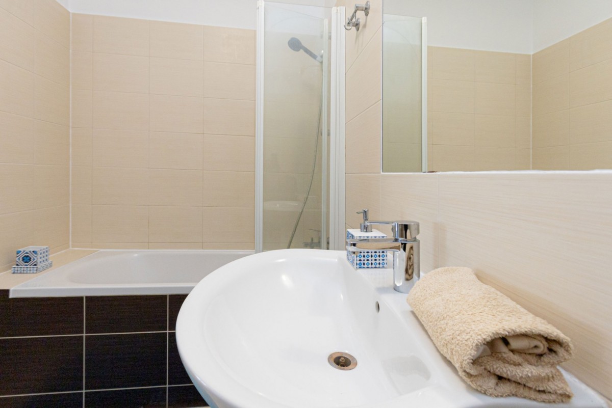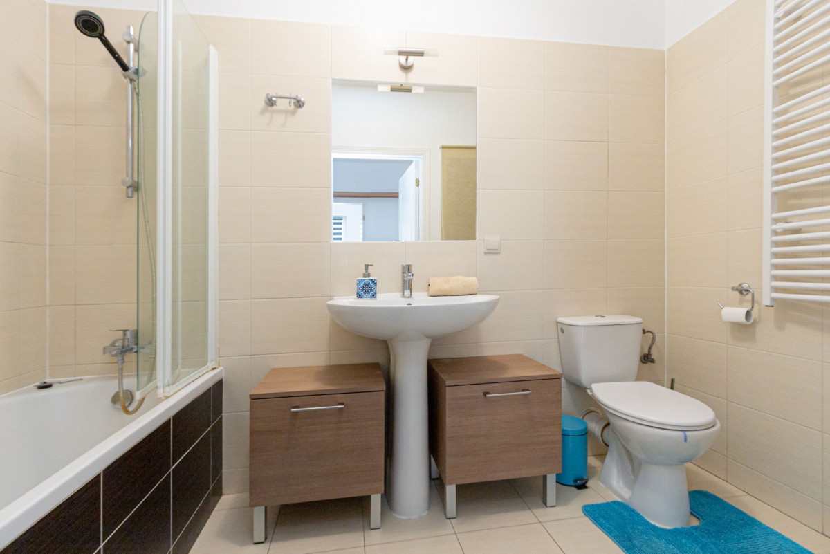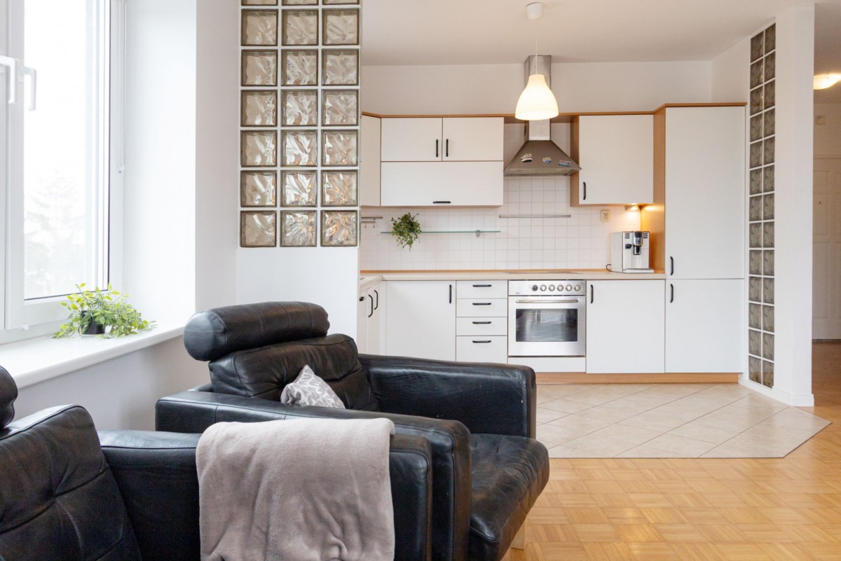 Mieszkanie znajduje się na 2 piętrze bardzo zadbanego budynku i składa się z obszernego salonu z otwartą kuchnią, dużej sypialni, dużej łazienki i dodatkowego pokoju mogącyego pełnić funkcję małej sypialni lub pokoju do pracy.