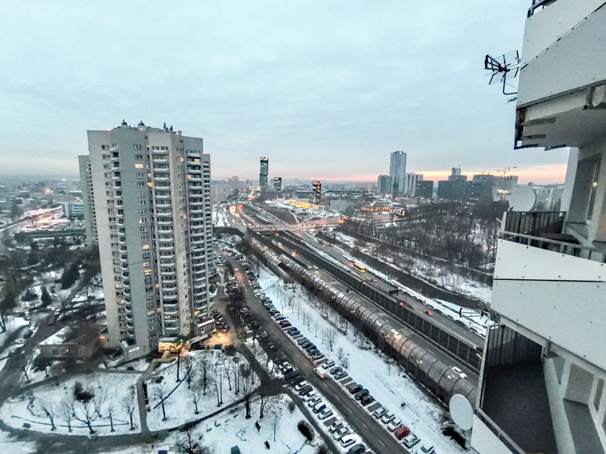 przestronnego pokoju dziennego z wyjściem na balkon i widokiem na miasto, który szczególnie docenia się wieczorami,
