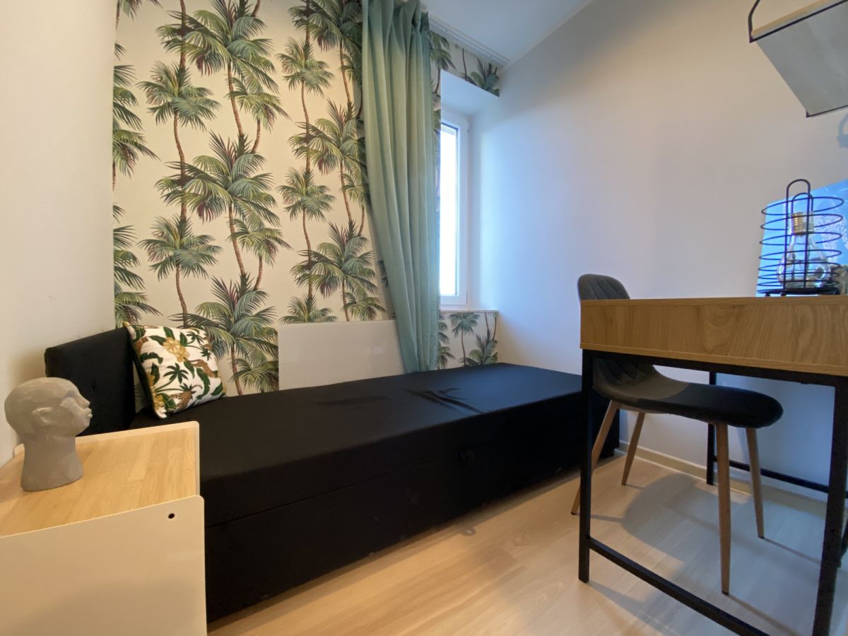 wyposażony w wygodne łóżko, pojemną szafę oraz biurko do pracy lub nauki.