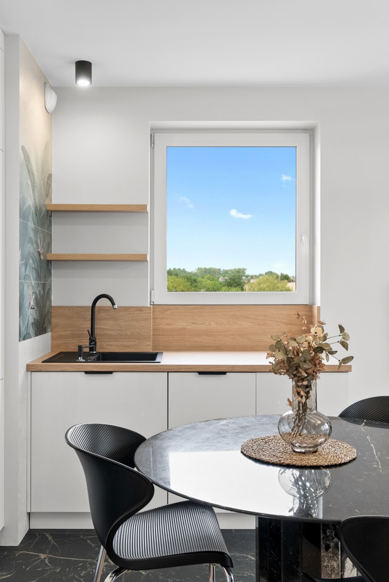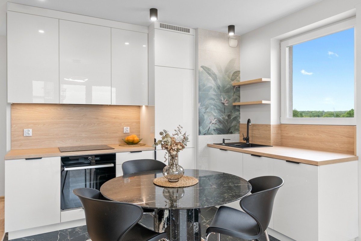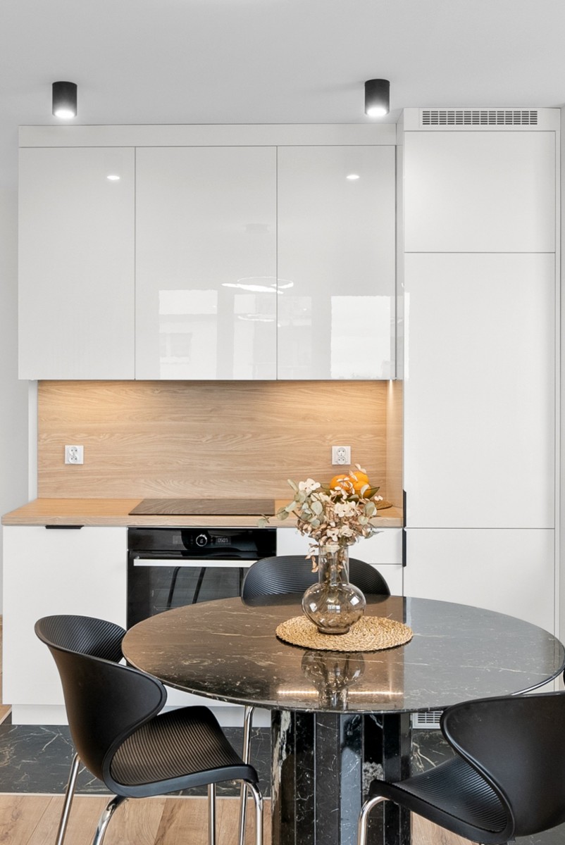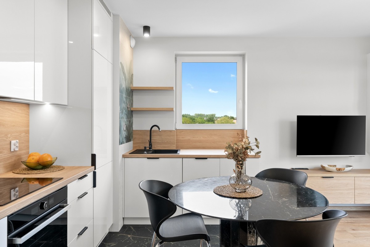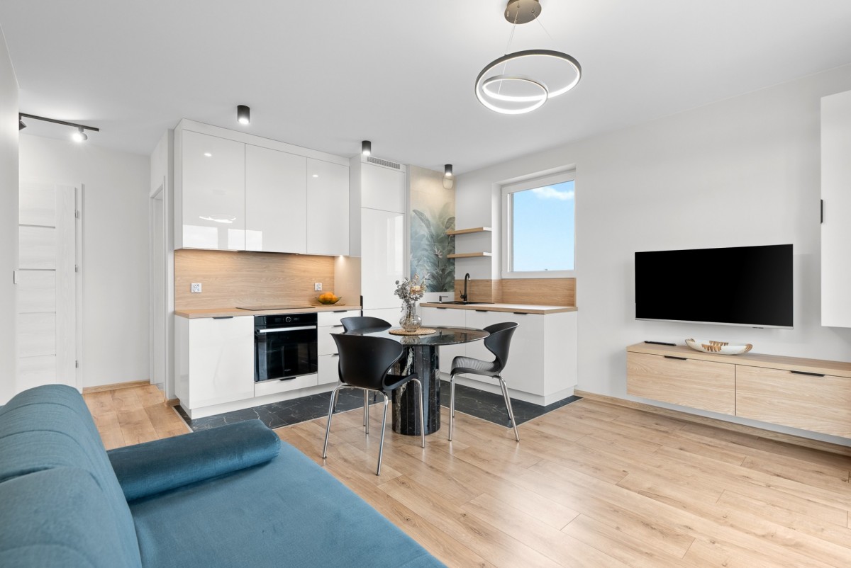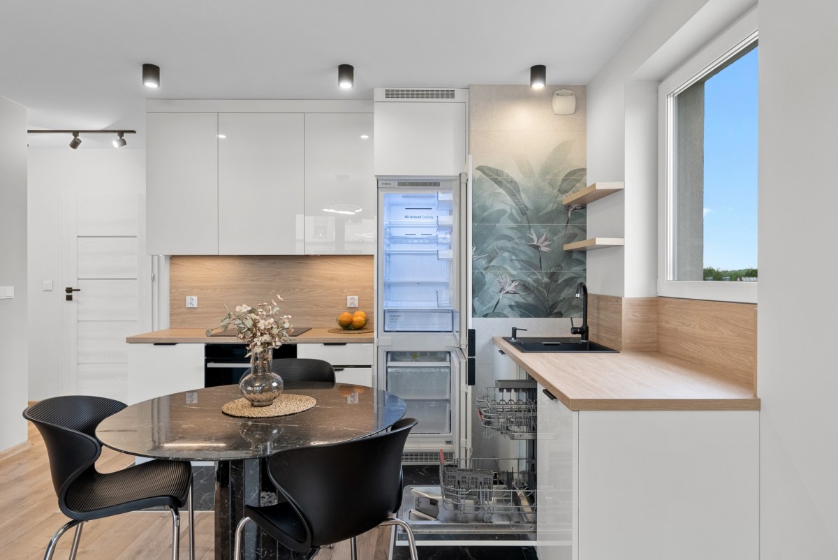 Pokój dzienny z aneksem kuchennym: zabudowa meblowa na wymiar wraz z pełnym sprzętem AGD.