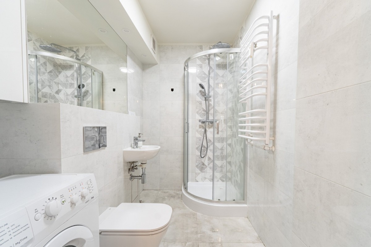 Łazienka wyposażona jest w kabinę prysznicową, WC, umywalkę oraz pralkę.
