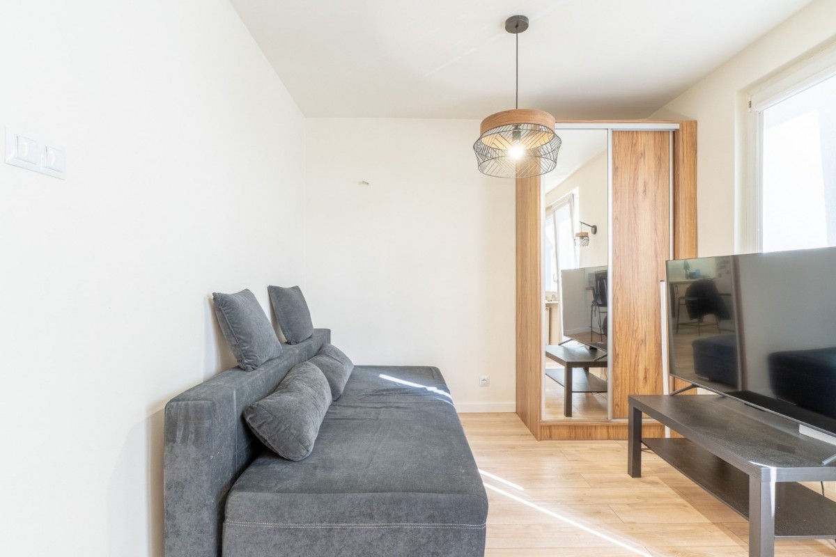 W salonie znajduje się szafa z lustrem oraz rozkładana sofa, na której wygodnie spać może 2 osoby.