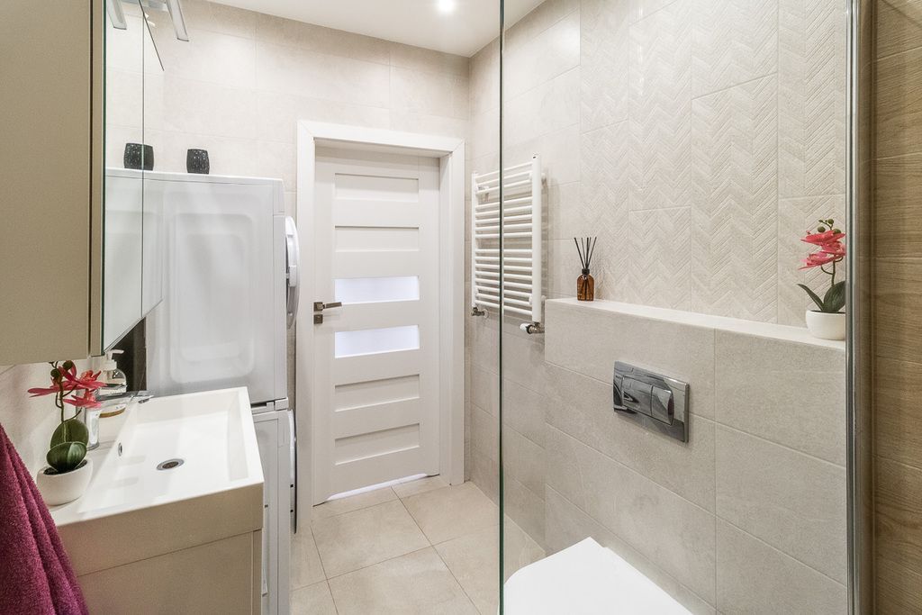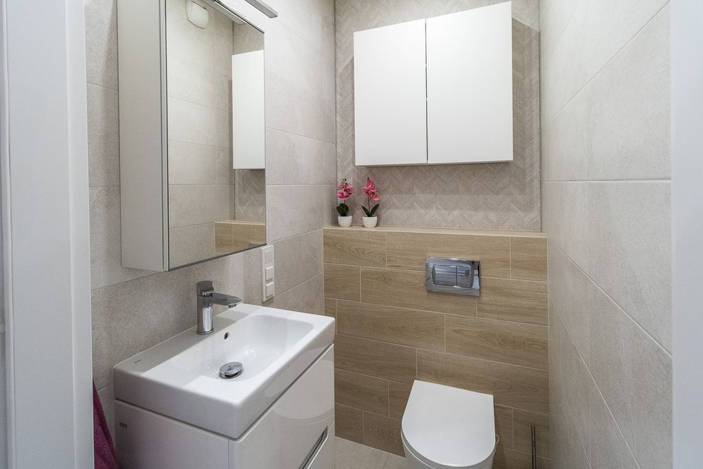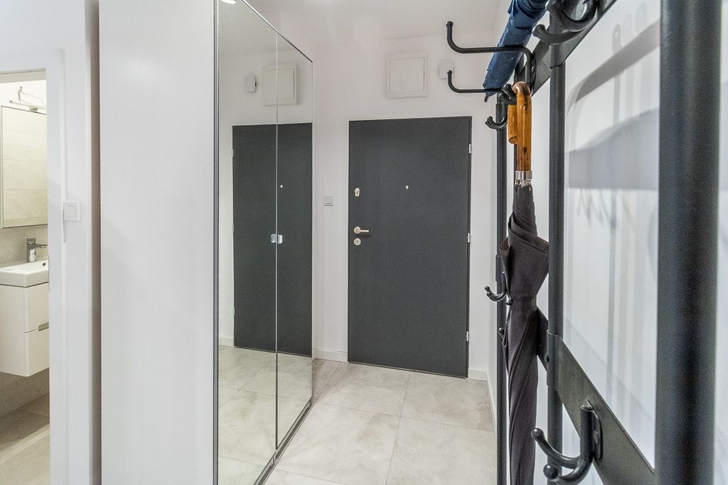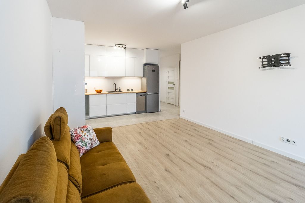 Otwarta kuchnia jest w pełni wyposażona: meble w zabudowie, lodówka z zamrażarką, zmywarka, okap, piekarnik, płyta grzewcza elektryczna, zlewozmywak . Łazienka z WC wyposażona w prysznic, pralkę, umywalkę, suszarkę i grzejnik drabinkowy. W mieszkaniu znajduje się też osobna toaleta z umywalką. Mieszkanie częściowo umeblowane, gotowe do zamieszkania.