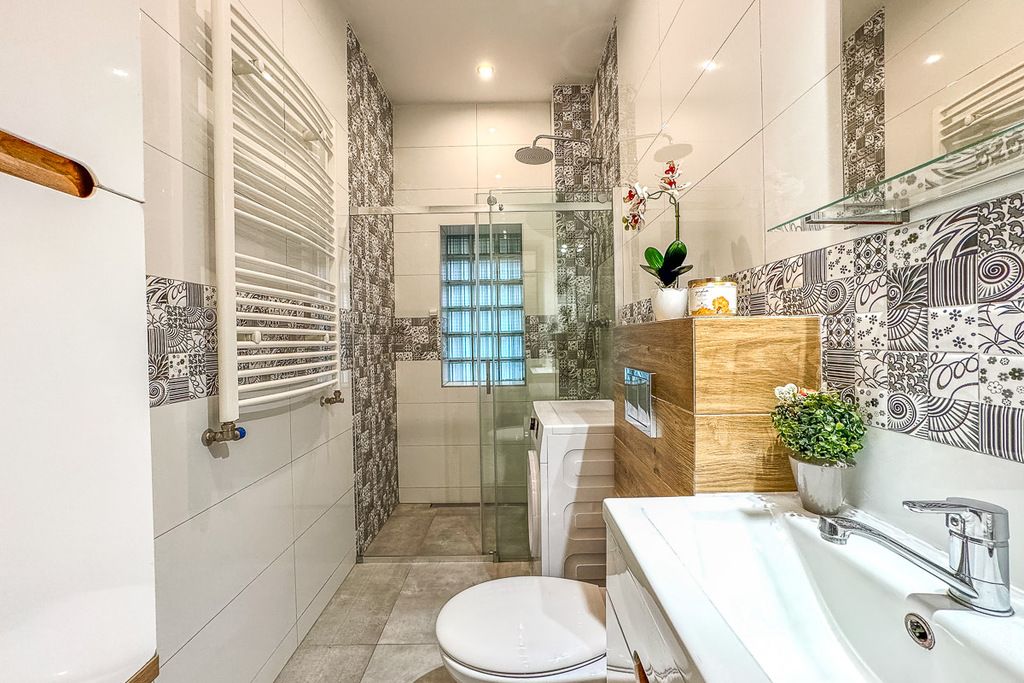 Jasne okna wychodzą na zachód, co zapewnia przyjemne doświetlenie wnętrza. Wysokość pomieszczeń to 270 cm, a podłogi wykończono panelami oraz płytkami. Aneks kuchenny jest w pełni wyposażony w meble w zabudowie, lodówkę, zmywarkę, okap, piekarnik, mikrofalówkę, elektryczną płytę grzewczą oraz zlewozmywak. Łazienka z WC posiada prysznic, pralkę, umywalkę oraz grzejnik drabinkowy. Mieszkanie jest w dobrym stanie, wyposażone w drzwi antywłamaniowe oraz okna PCV.