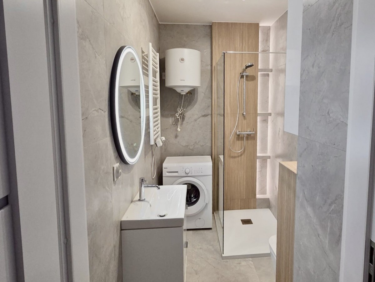 W przedpokoju znajduje się pojemna, nowoczesna szafa przesuwna z lustrami, która optycznie powiększa przestrzeń. Łazienka - wykończona wielkoformatowymi płytkami o wzorze marmuru, z komfortową kabiną typu walk-in, efektownym podświetlanym lustrem LED oraz nową pralką. Całość dopełniają wysokiej jakości panele podłogowe oraz eleganckie, białe drzwi z czarnymi okuciami. Z salonu wyjście prowadzi na balkon. Do mieszkania przynależy prywatne miejsce postojowe w hali garażowej, co zapewnia komfort parkowania o każdej porze roku.