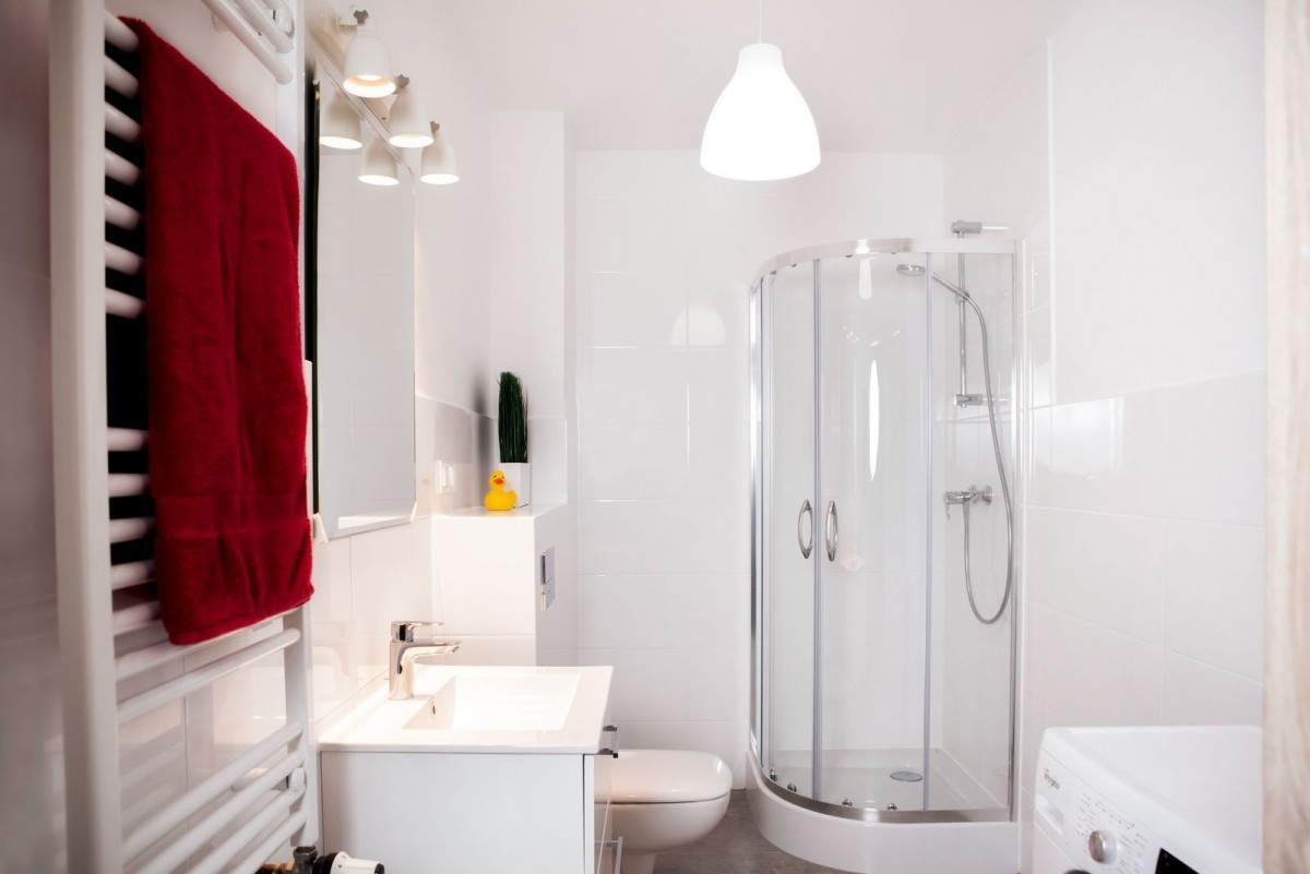 • łazienka z kabiną prysznicową i pralką;