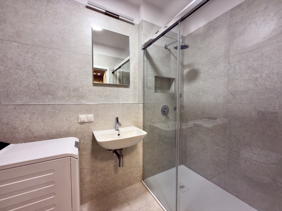 W łazience znajduje się komfortowy prysznic oraz pralka.
