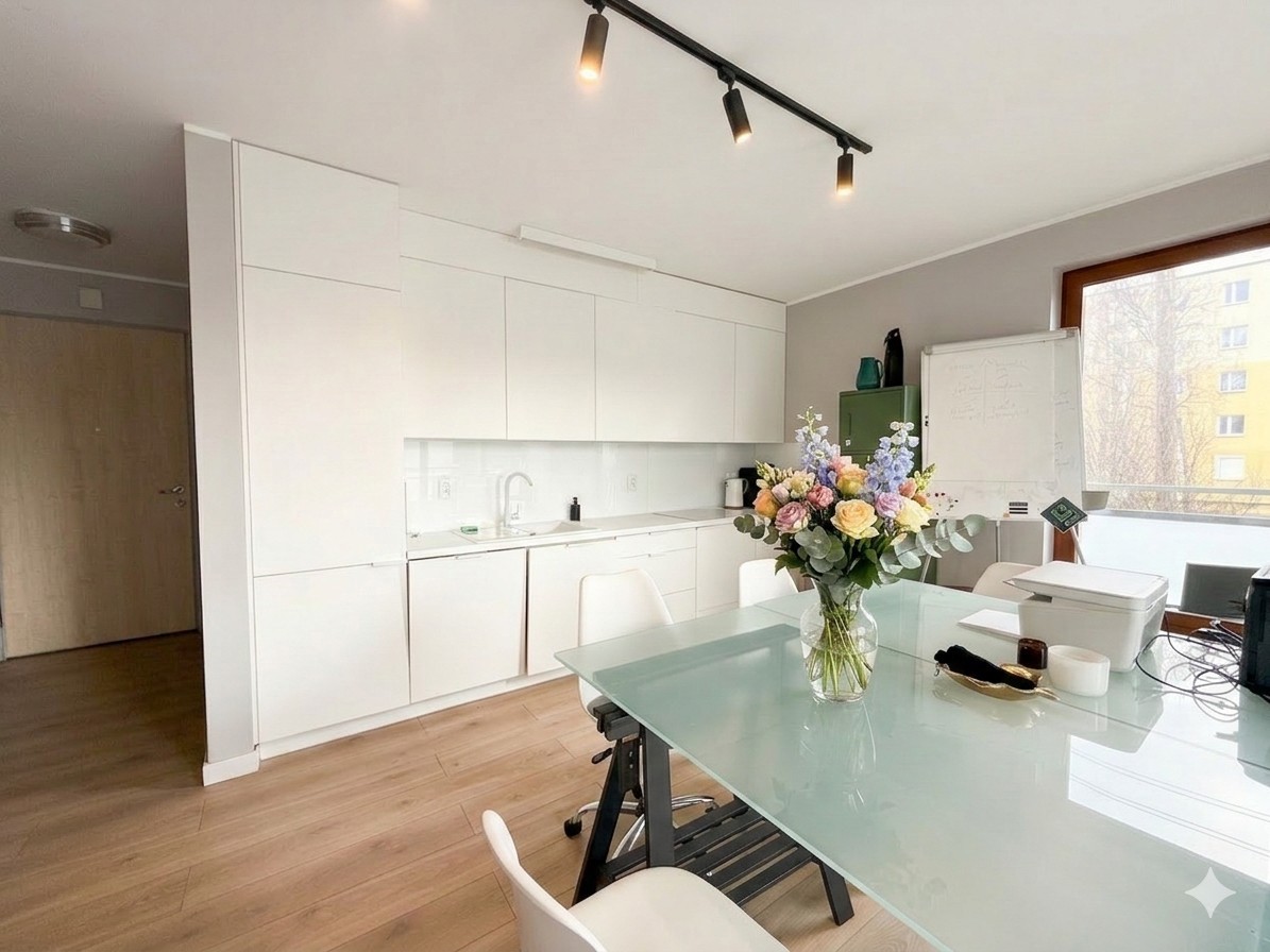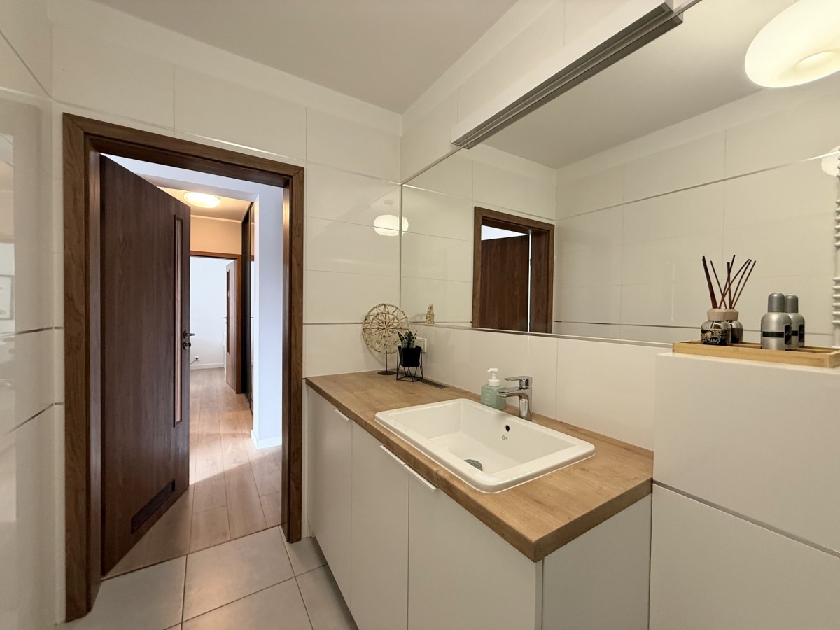 Kuchnia jest nowoczesna, jasna i wykonana w zabudowie, co gwarantuje funkcjonalność oraz nowoczesny wygląd. W mieszkaniu znajduje się również duża łazienka wyposażona w prysznic oraz pralkę.