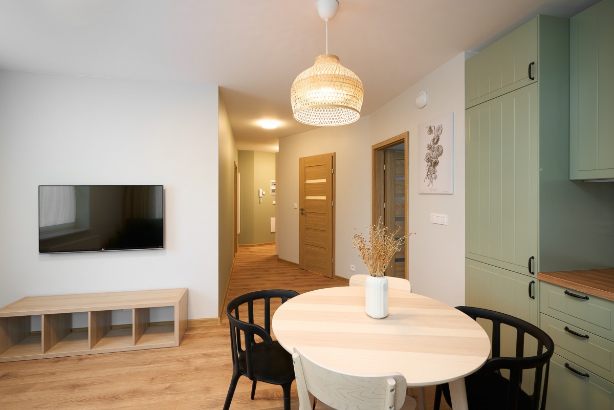 1. Salon z aneksem kuchennym (19,21 m2): Przestronny salon. Duże panoramiczne okno z wyjściem na balkon. W salonie znajduje się wygodna sofa, szafa RTV oraz telewizor. To idealne miejsce do spędzania czasu z rodziną. Aneks kuchenny jest w pełni wyposażony w nowoczesne urządzenia.