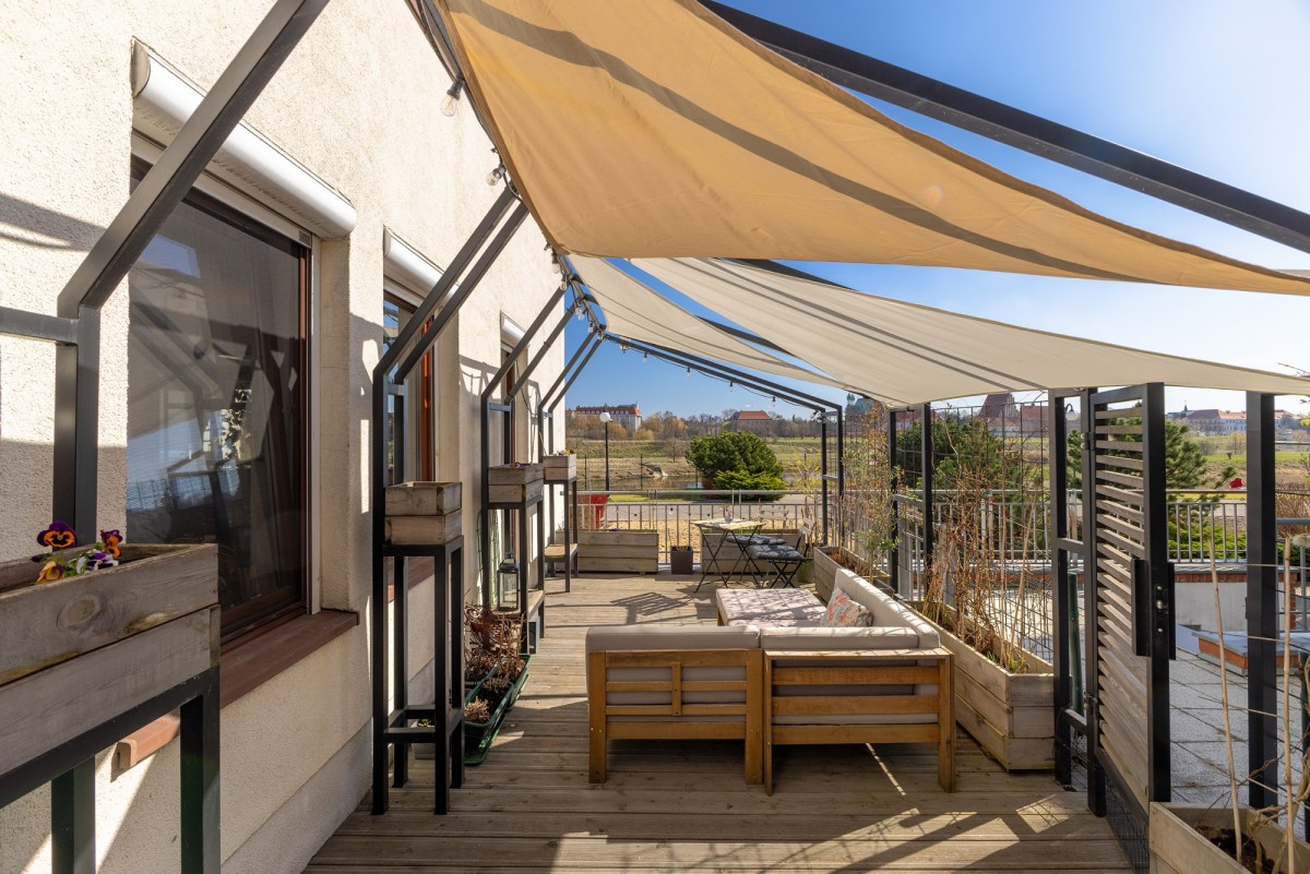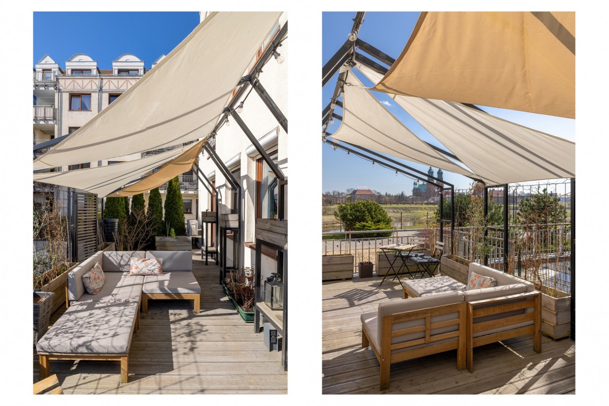To mieszkanie znajduje się zaledwie kilka minut spacerem od Starego Rynku, a jednocześnie w spokojnym miejscu nad Wartą. Z dużego, zielonego tarasu rozciąga się widok na rzekę oraz katedrę. To przestrzeń, w której można naprawdę odetchnąć po dniu w mieście.