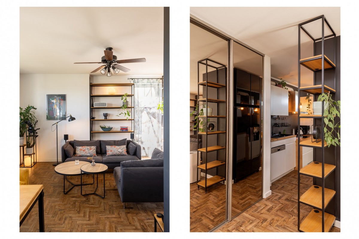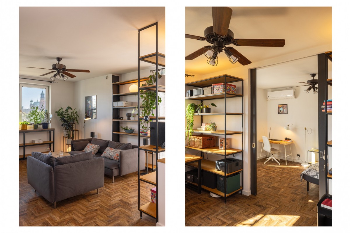 Salon: strefa wypoczynkowa, kanapa, fotel stół, regały oddzielające strefy w mieszkaniu