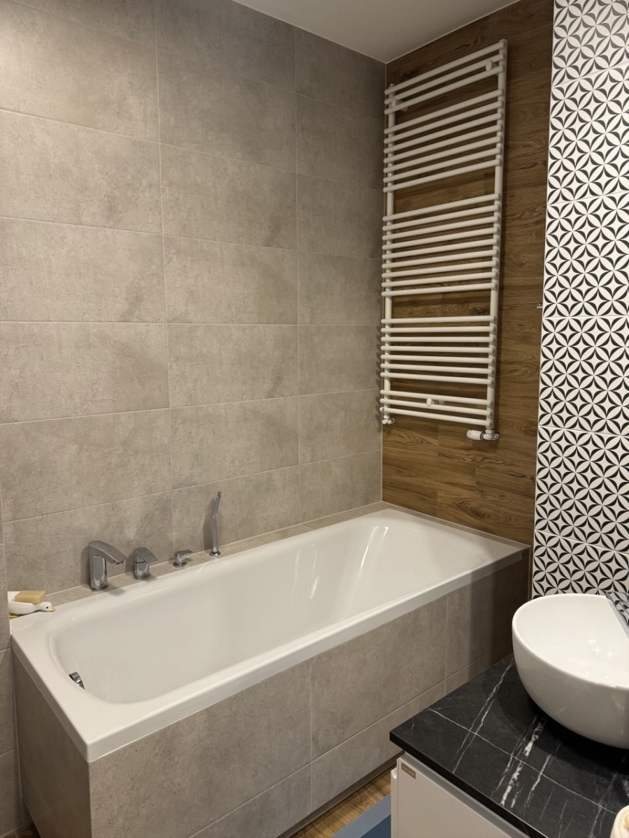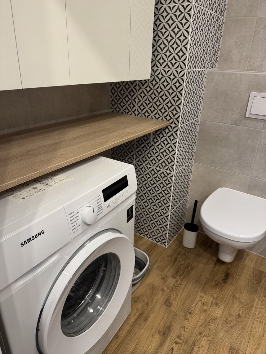 - nowoczesna łazienka z wanną i pralką.