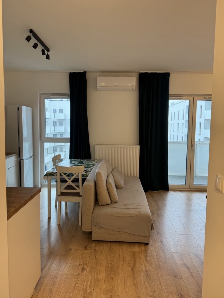 - przestronny salon z aneksem kuchennym, klimatyzacją i wyjściem na balkon z widokiem na cichy, zielony dziedziniec,
