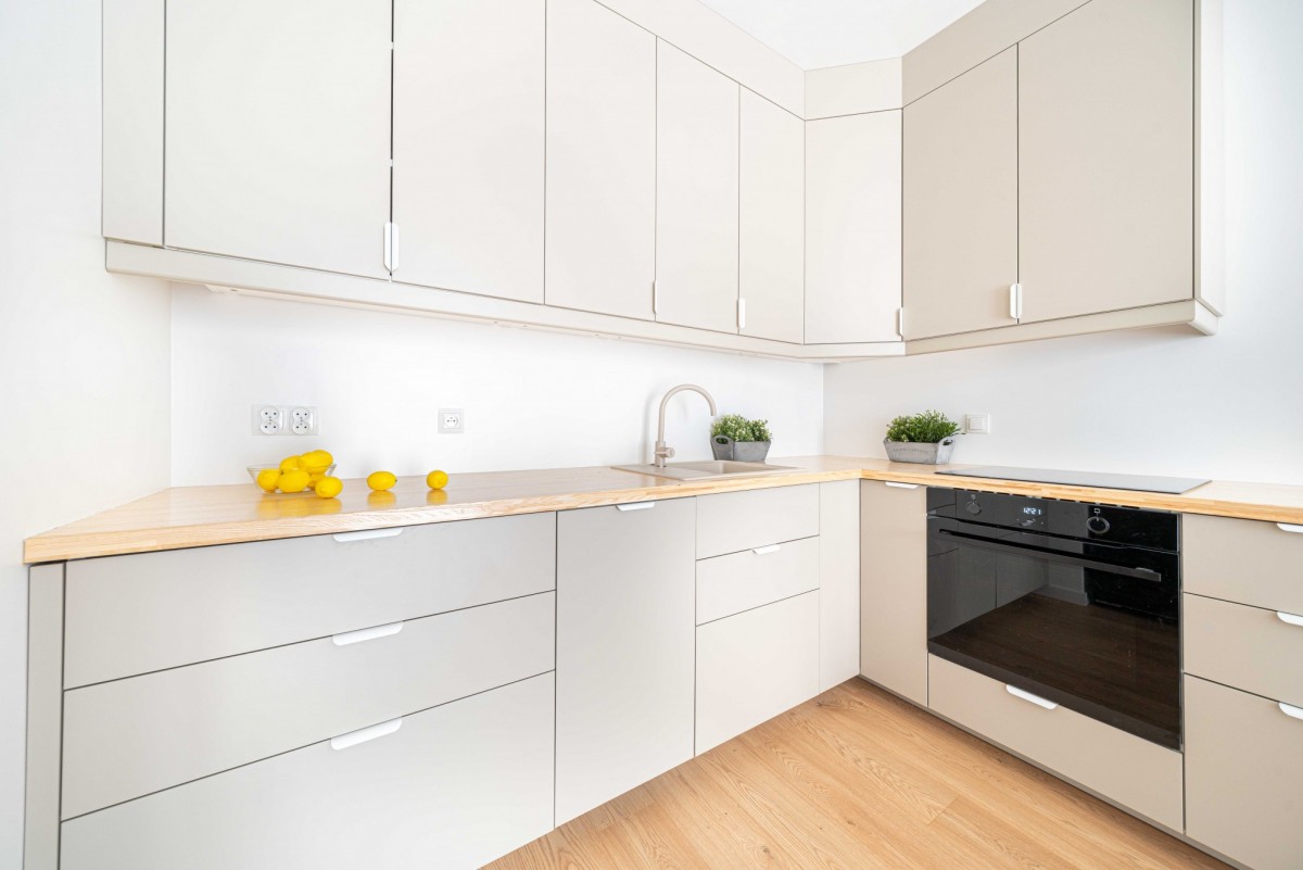 • nowoczesna kuchnia na wymiar ze sprzętem AGD (płyta, piekarnik, zmywarka, lodówka, okap),