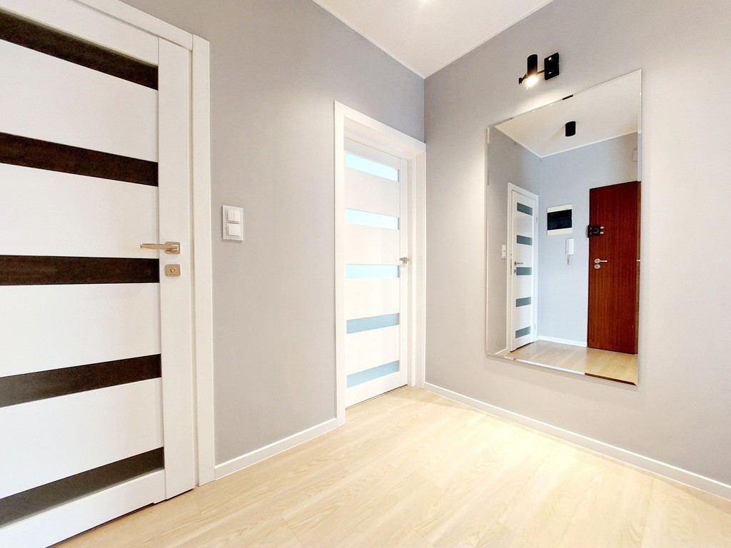 Salon z aneksem kuchennym wyposażonym w meble w zabudowie kuchennej, sprzęty AGD (zmywarka, płyta gazowa, lodówka). Salon mieści dużą narożną sofę. Łazienka z wanną, pralką w zabudowie, toaletą i umywalką. Korytarz jest przestronny z dużą zabudowaną szafą.