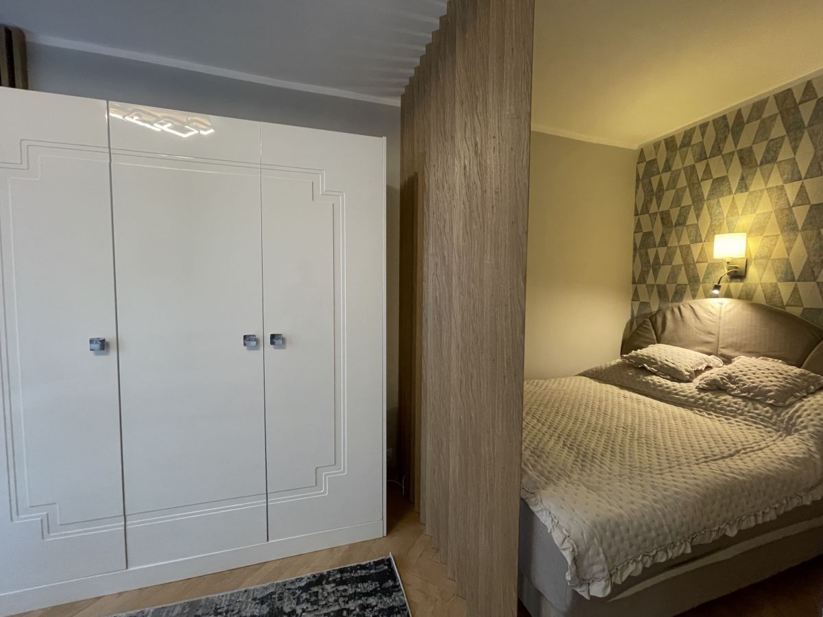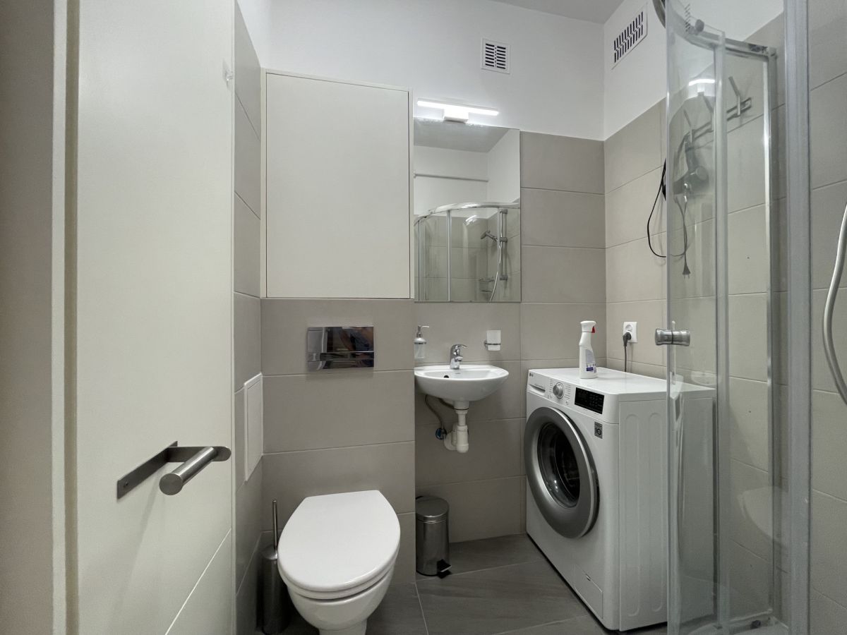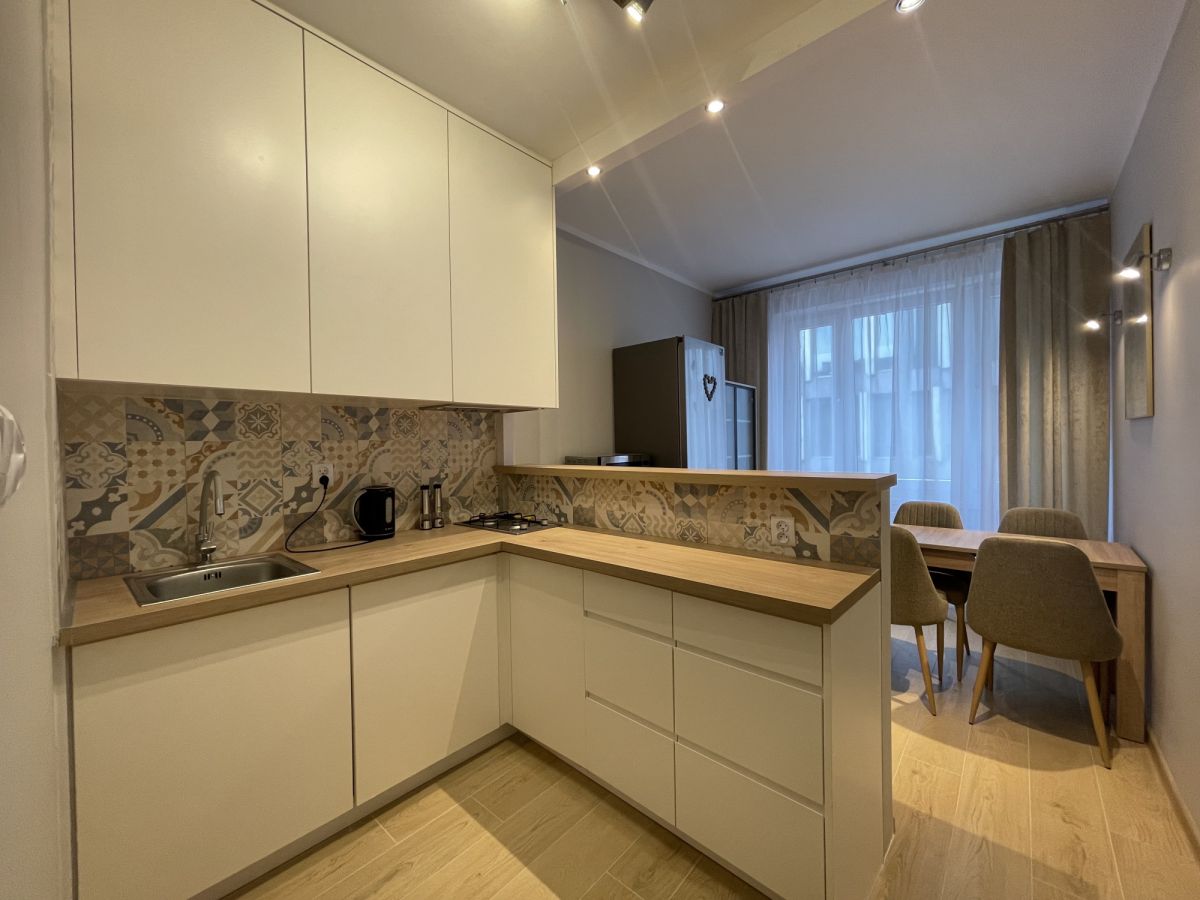Mieszkanie przeszło remont generalny i czeka na pierwszego najemcę. Do dyspozycji wszystko nowe: 65 calowy TV, małe AGD (odkurzacz, praska itp), szerokie łóżko małżeńskie, mikrofala, strefa jadalniana co raczej niespotykane przy tego typu mieszkaniach i wiele innych udogodnień. W kuchni zmywarka 60-tka. Brak piekarnika wbudowanego, jest natomiast wolnostojący, niewidoczny na zdjęciach. Pokój dzienny podzielony na strefy, łóżko jest schowane i niewidoczne od wejścia. Bardzo przyjemne oraz dobrane do siebie kolory wnętrza, Przyjemnie się tu po prostu mieszka.