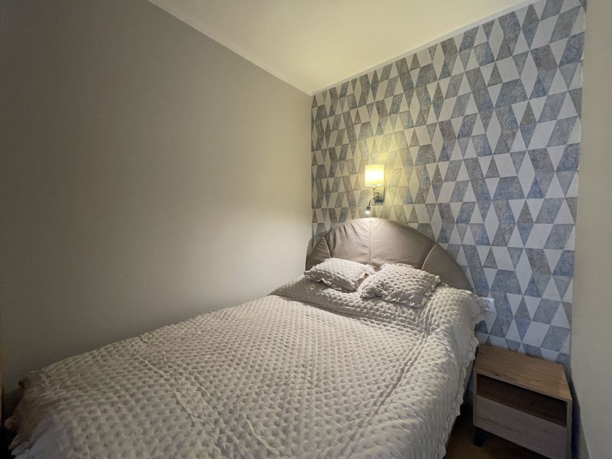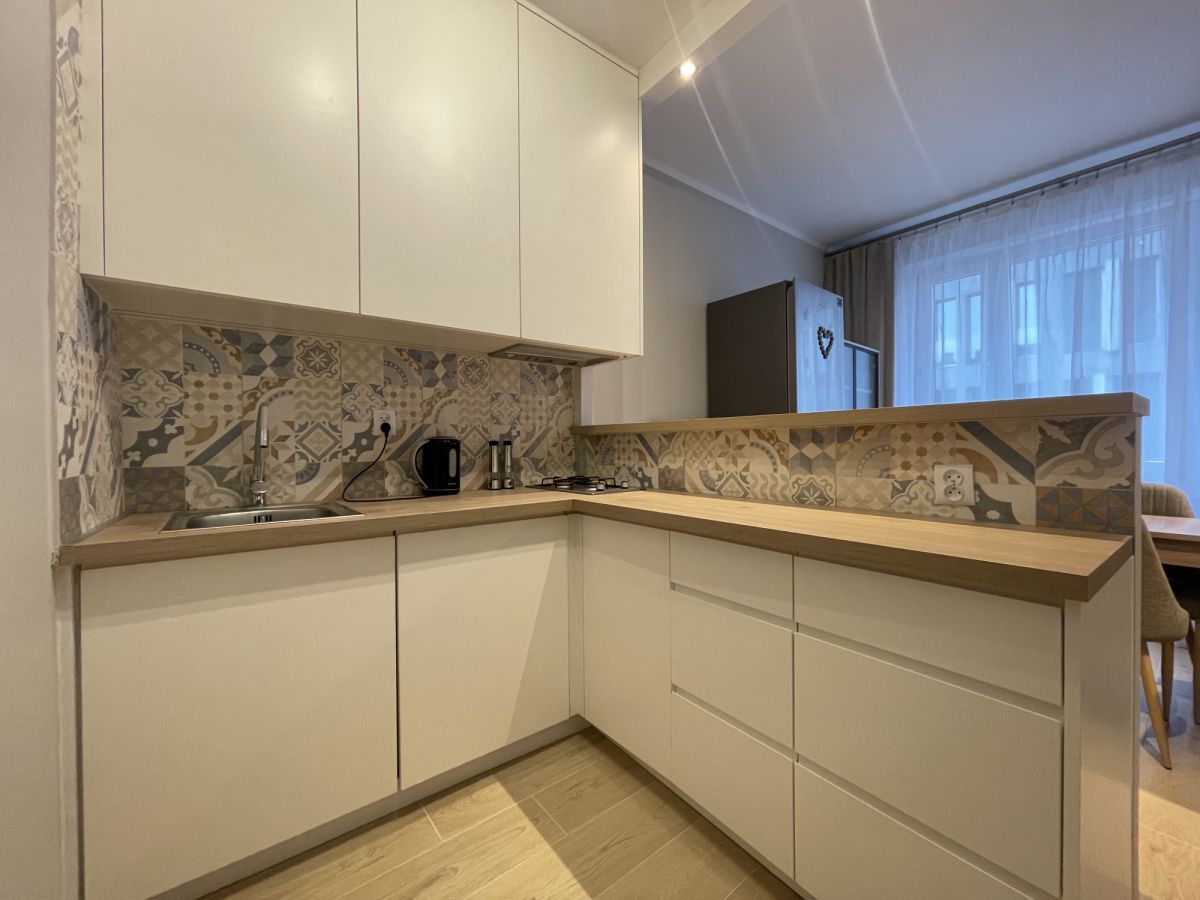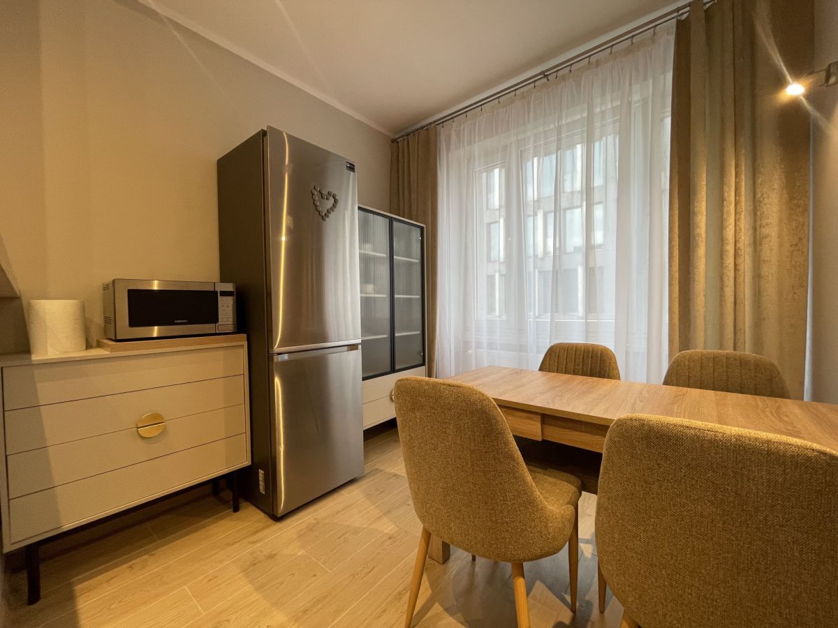 Mieszkanie przeszło remont generalny i czeka na pierwszego najemcę. Do dyspozycji wszystko nowe: 65 calowy TV, małe AGD (odkurzacz, praska itp), szerokie łóżko małżeńskie, mikrofala, strefa jadalniana co raczej niespotykane przy tego typu mieszkaniach i wiele innych udogodnień. W kuchni zmywarka 60-tka. Brak piekarnika wbudowanego, jest natomiast wolnostojący, niewidoczny na zdjęciach. Pokój dzienny podzielony na strefy, łóżko jest schowane i niewidoczne od wejścia. Bardzo przyjemne oraz dobrane do siebie kolory wnętrza, Przyjemnie się tu po prostu mieszka.