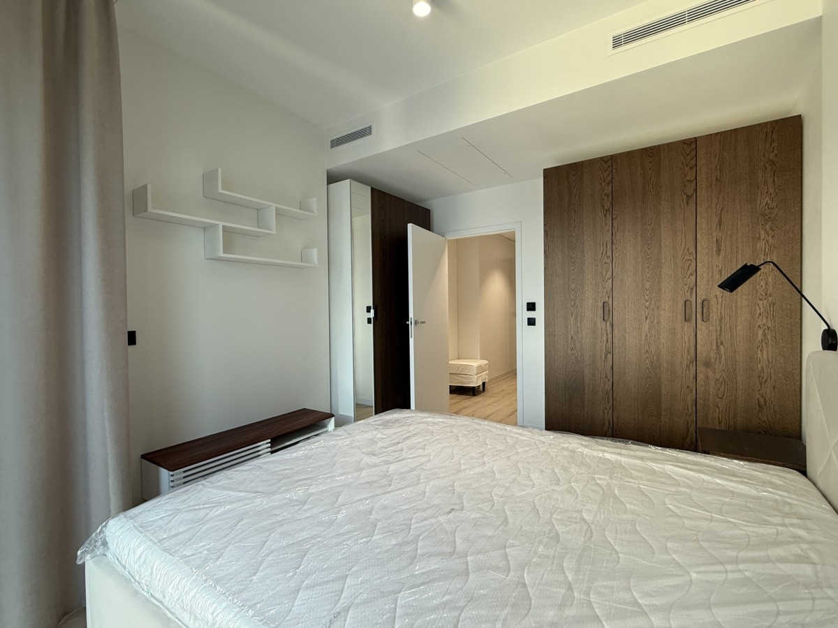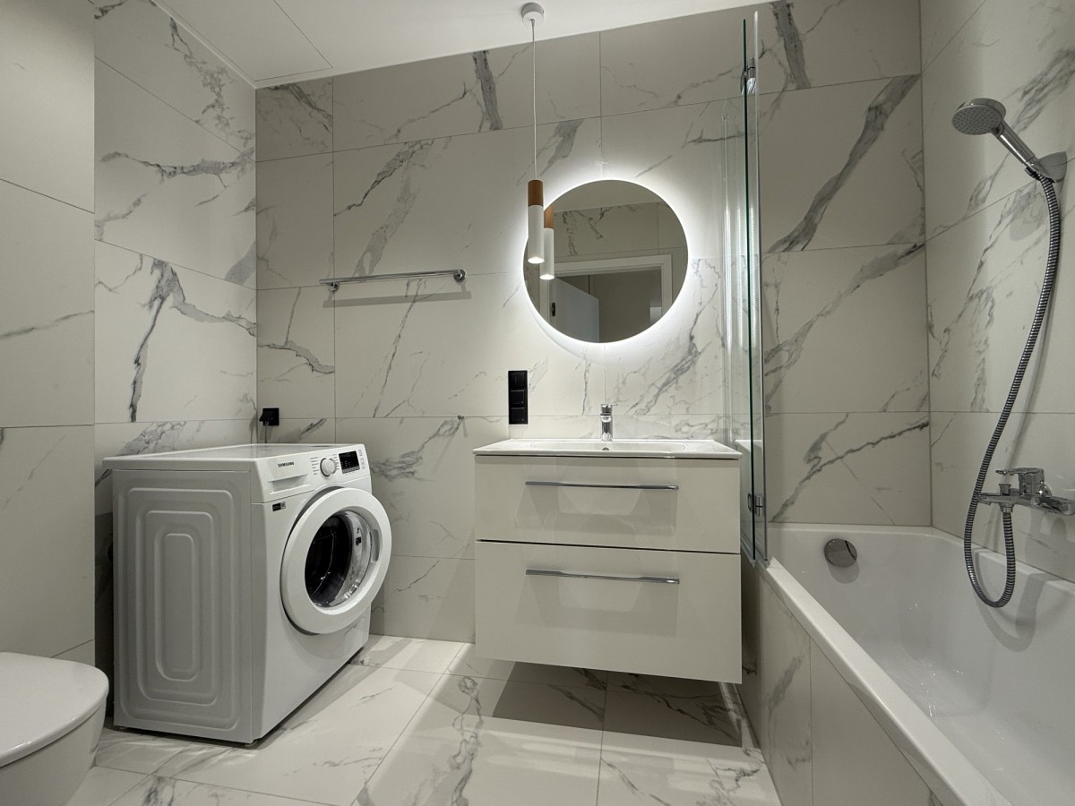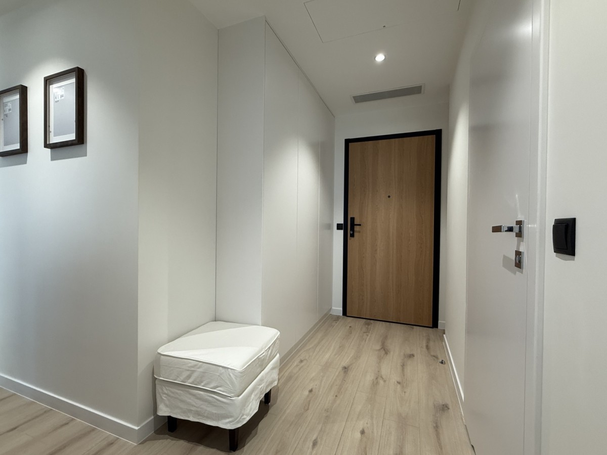 Ten nowoczesny apartament o powierzchni ok 46 m², zaprojektowany przez architekta, składa się z przestronnego salonu z aneksem kuchennym (w pełni wyposażonym w meble i sprzęt AGD), osobnej sypialni, łazienki z wanną oraz korytarza z zabudowaną szafą.